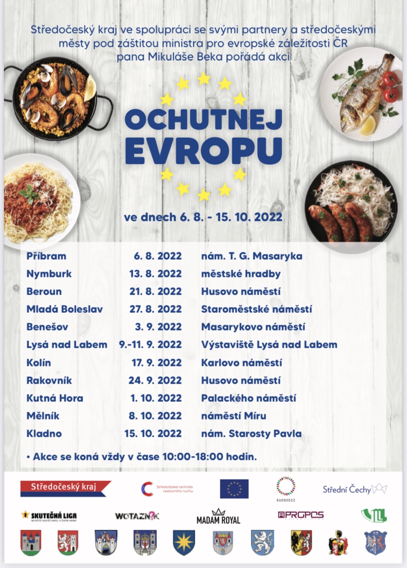 Na začátku srpna odstartovala série akcí Ochutnej Evropu, které v rámci předsednictví České republiky v Radě Evropské Unie pořádá Středočeský kraj. Po úspěšných zastávkách v Příbrami a Nymburce je připraveno dalších osm zastávek ve větších středočeských městech. Akce Ochutnej Evropu probíhají pod záštitou ministra pro evropské záležitosti ČR pana Mikuláše Beka.