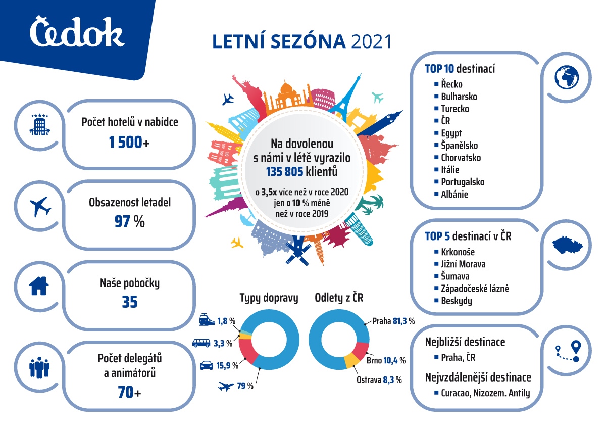 Na dovolenou s Čedokem vyrazilo letos v létě přes 135 tisíc klientů, dokonce 3,5krát více než v roce 2020. S nejstarší cestovní kanceláří v České republice cestovalo od května do konce října pouze o 10 % lidí méně než před pandemií, což potvrzuje, že Češi mají chuť znovu cestovat. Mezi nejoblíbenější země, do kterých v hlavní sezoně zamířili nejčastěji, patří Řecko, Bulharsko a Turecko. I přes zhoršenou epidemiologickou situaci zájem o letecké zájezdy neklesá, ukazují to i aktuální prodeje na probíhající zimní sezonu i příští léto. Čedok proto reaguje na současné cestovatelské zvyklosti i trendy. Od prosince například spouští výhodné nabídky pro klienty, kteří mají možnost pracovat na dálku a chtějí tak vyměnit práci z domova za pobyt v zahraničí.