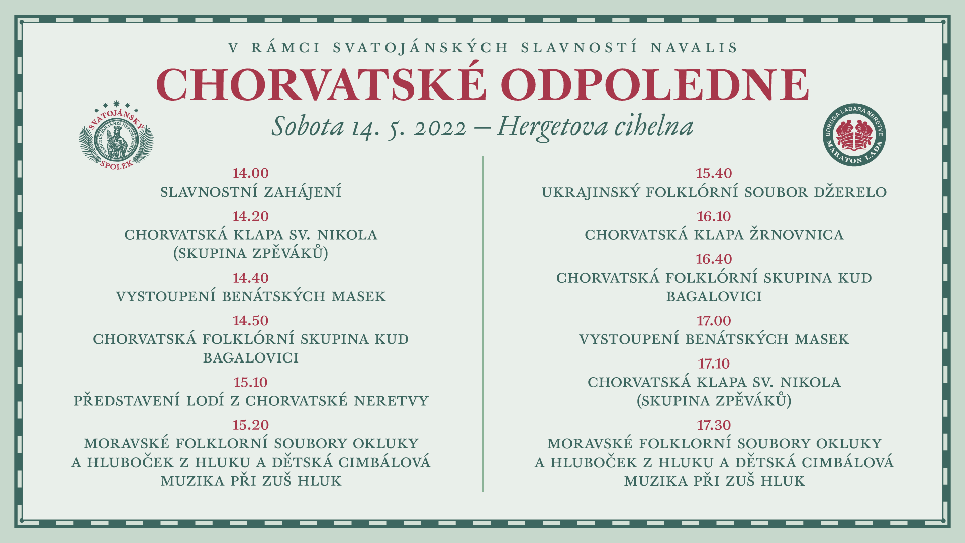 „Chorvatským dnem“ bude 14. květen, kdy budou neretvanští převozníci, Kulturně-umělecký spolek Bagalovići, kulinářský a zábavní Spolek Pivčeva kala, soubor Klapa Sv. Nikola z Metkoviće a jejich přátelé prezentovat v centru Prahy u Vltavy a na ní od 14 do 18 hodin neretvanskou kulturu, písně a zvyky, místní kuchyni, projížďky na lodích, lodní maraton a také krásy Neretvy a Chorvatska. Převozníci rovněž speciálními aktivitami projeví solidaritu s obyvateli Ukrajiny. Program: https://www.navalis.cz/upload/program/Navalis_2022_A5_Chor-Odpol_PRINT.pdf