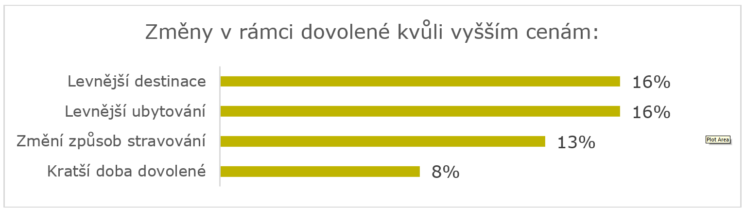 16 % respondentů uvedlo, že na dovolenou plánuje vyrazit, ale vybere si levnější destinaci. Dalších 16 % si vybere levnější ubytování. 13 % kvůli vysokým cenám změní způsob stravování a 8 % pojede na kratší dobu.