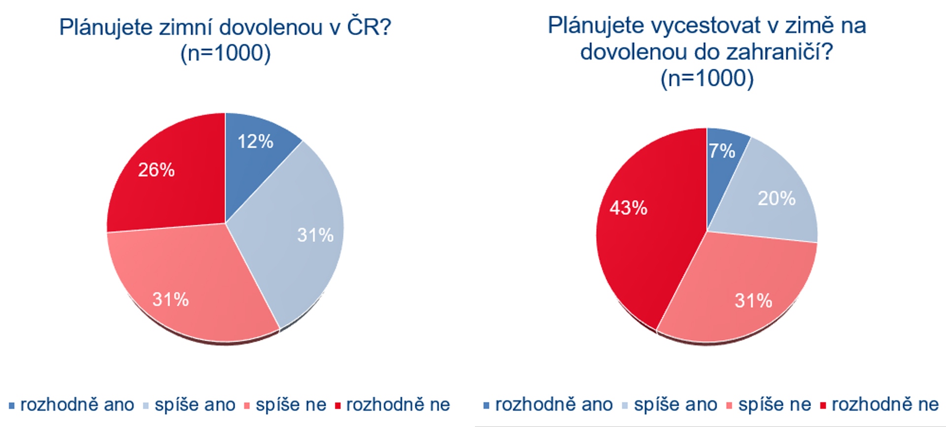 Z průzkumu dále vyplývá, že především kvůli nedostatku financí, covidovým opatřením nebo obavám z nákazy neplánuje zimní dovolenou více než polovina Čechů (57 %). Zimní dovolenou v zahraničí pak plánuje 27 % Čechů. Více nakloněni zahraniční dovolené jsou mladí lidé 18–30 let (42 %) a lidé s nejvyššími příjmy (41 %).