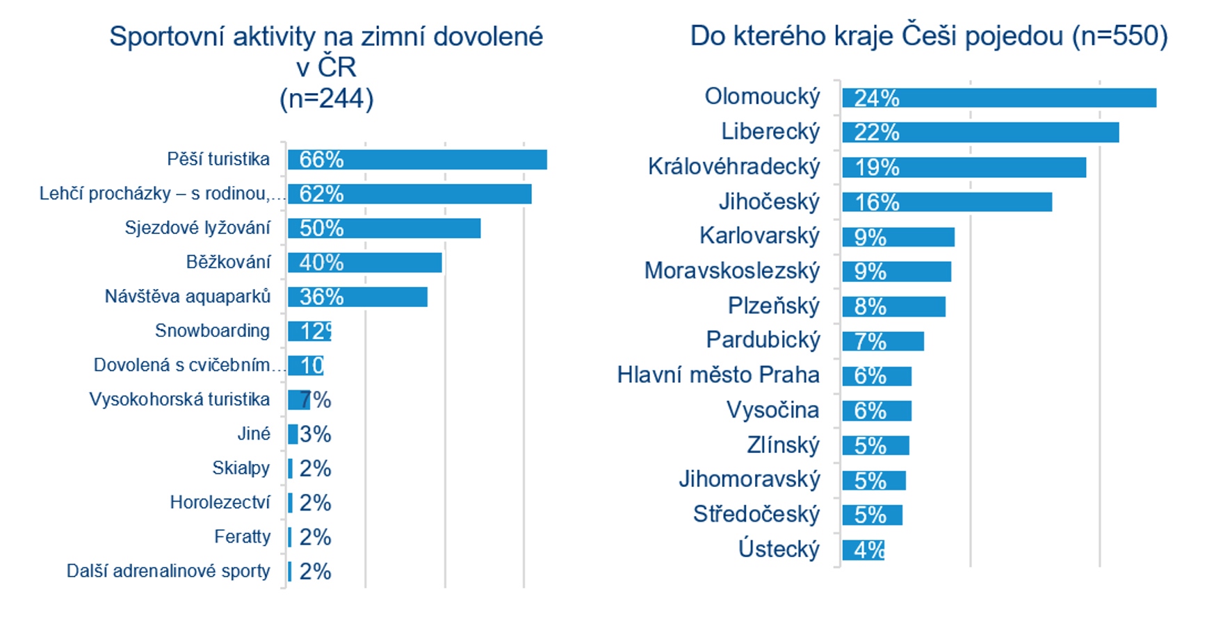 Podle průzkumu* bude zimní dovolená trvat nejčastěji osm dní a Češi za ni plánují utratit zhruba šest a půl tisíce korun na osobu, z toho téměř polovinu za ubytování. Nejčastější aktivitou během dovolené budou procházky a pěší turistika, sjezdové i klasické lyžování doplněné o návštěvu aquaparku. Téměř čtvrtina z těch, kteří plánují zimní dovolenou v ČR, plánuje navštívit Olomoucký kraj (24 %), více než pětina Liberecký kraj (22 %) a další pětina Královéhradecký kraj (19 %). Nejoblíbenějším typem ubytování jsou penziony.