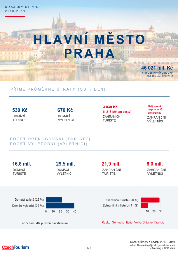 Titulní strana krajského reportu obsahuje nejdůležitější data za daný kraj (HPH cestovního ruchu v daném kraji, strukturu návštěvníků v dělení na domácí turista/výletník, zahraniční turista/výletník a přímé průměrné útraty na osobu a den každé z těchto zmíněných skupin).