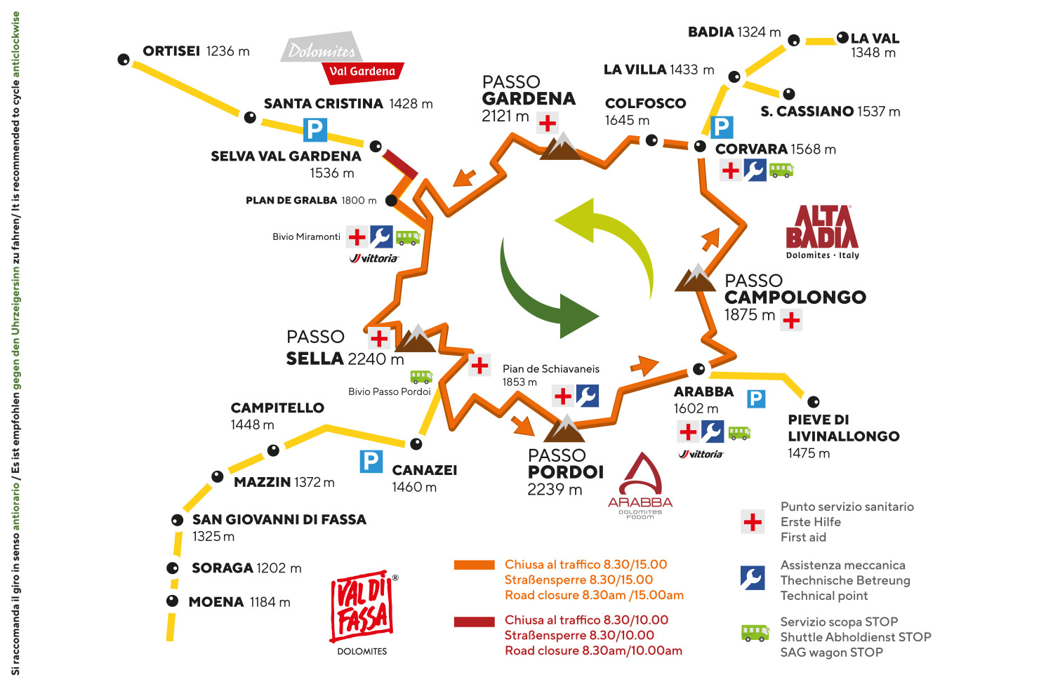 Jedná se o volnou projížďku pro cyklisty všeho druhu a rozličné výkonnosti, v den jejího konání však je na vyznačených silnicích uzavřená doprava. Pořídí vám tu fotky, můžete si koupit památeční dresy i čapky, a samozřejmě, pokud máte chuť, zmáčknete i stopky. Trasa už tradiční Sella Ronda Bike Day vede přes čtyři horské průsmyky Sella – 2240 m, Gardena – 2121 m, Pordoi – 2239 m a Campolongo – 1875 m a měří 53 kilometrů s převýšením 1637 metrů. Účastní se jí pravidelně až dvacet tisíc cyklistů z celé Evropy. Teď se tu jede tuto sobotu 11. června se silnicí zavřenou pro auta od 8.30 do 15.30. V posledních letech se pro velký zájem přidal i podzimní termín (letos 17. září).