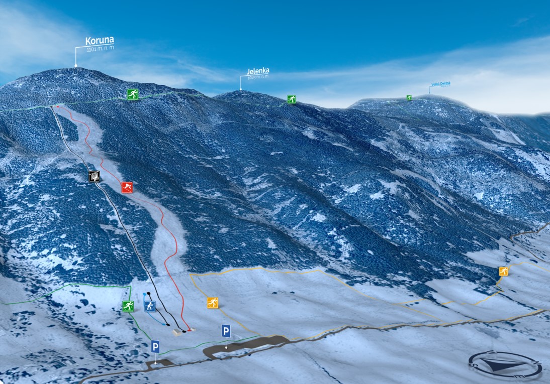 Čtyřsedačková lanovka stoupá po severním svahu pod Korunu (1025 m), druhý nejvyšší vrchol Orlických hor. Má 15 sloupů, jízda průsekem nad stromy trvá sedm minut. Sjezdovka začne červenou částí, pak se rozvolní do modré se zábavným „pumptrackem“ po pravé straně a nakonec i rozšíří do opět prudší části, kde můžete vyrýsovat dlouhý carvingový oblouk v plné rychlosti. Až dojezd loukou s osvětleným nejdelším běžeckým okruhem v zemi (4,5 km) zůstává hodně mírný.