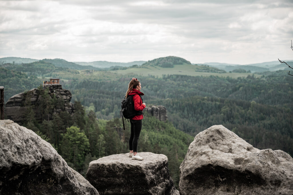 Kolem Malé Pravčické brány a loupežnického hrádku Šaunštejn pronikneš do čtvrté etapy Hřebenovky. Jestli máš duši dobrodruha, můžeš vyšplhat na temeno skály Šaunštejnu, Rudolfova kamene nebo Mariiny vyhlídky. Tady vede ta pravá Hřebenovka po hranách Jetřichovických skal.