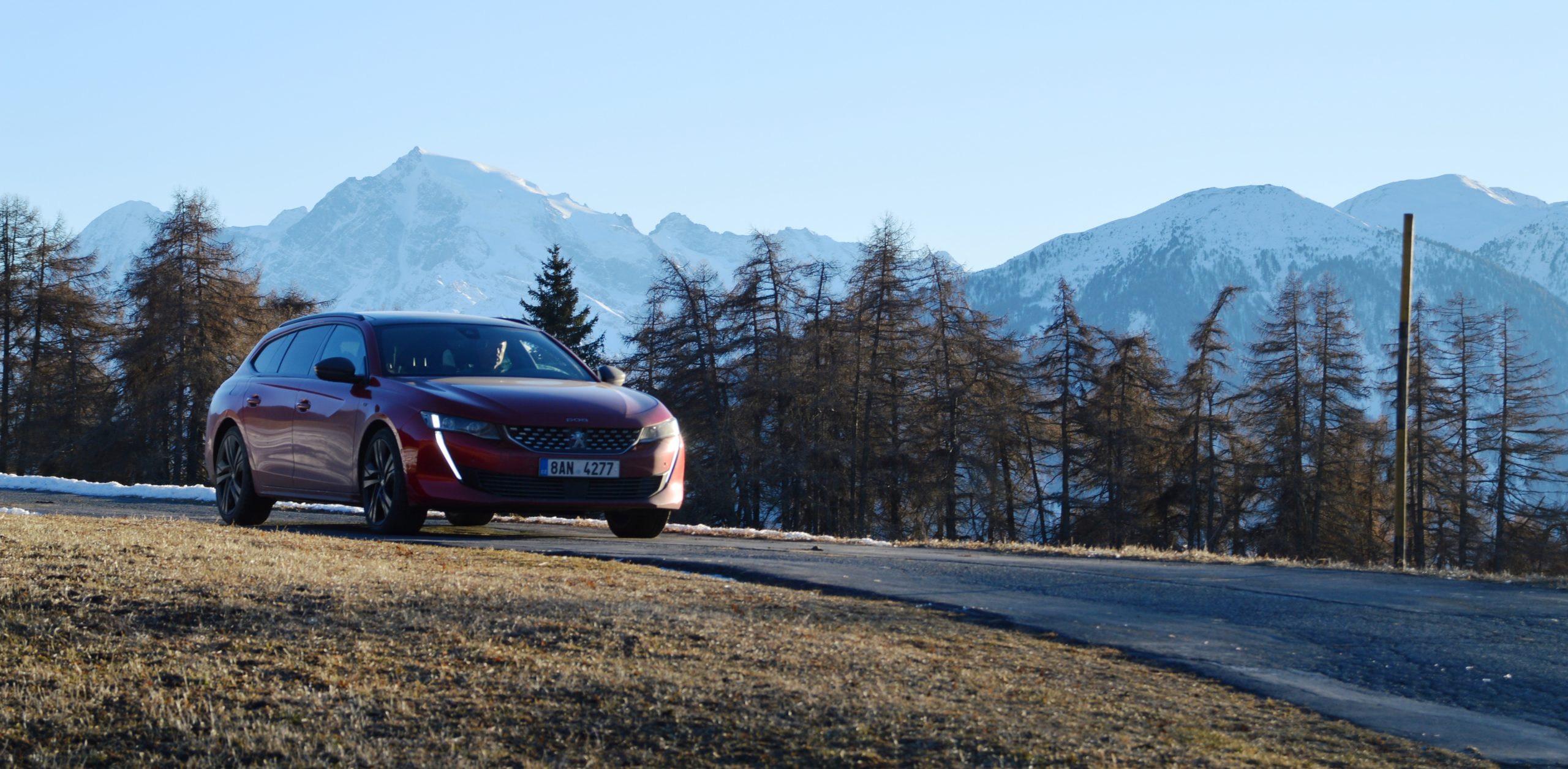 Přesně ve čtyřech lidech a s jejich zavazadly, třemi páry sjezdovek (uvnitř). Najeto k 1600 km, povětšinou po německé dálnici, ale i přes rakouský Fernpass a jeho serpentiny, a pak Reschenpass, uličkami Malsu, Glurnsu a Pradu až zase vzhůru do Suldenu. Pohodlně, spotřeba benzinu s trvalým topením těsně pod osm bez omezování (se). Jeli jsme v lepší verzi vozu, přesně SW GT PACK PureTech 225 S&S EAT8.