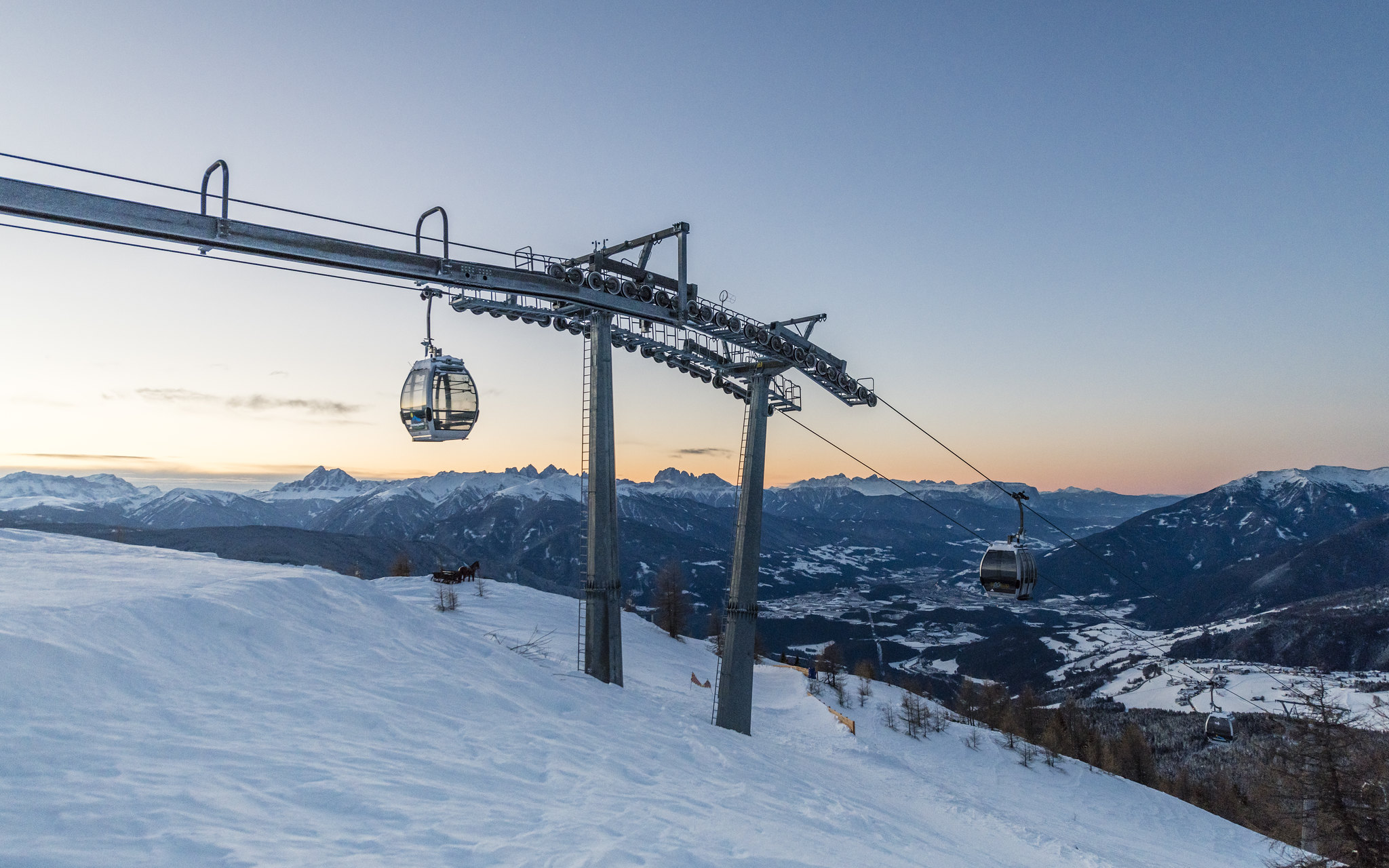 Do Valsu/Vales, odkud stoupají lanovky na Jochtal, musíte autem/busem na opačnou stranu přece jen sami. Je to už vysokohorské údolí ve výšce okolo 1300 metrů. Silnice tu končí, takže ten správný konec světa. Právě na Jochtal (2006 m) se jezdí gondolou za východem slunce… Oba kopce propojuje od roku 2011 lanovka mezi hřebeny, takže zde v Pfunderer Berge, jak se tohle alpské pohoří přesně jmenuje, vyrostl zajímavý společný dvojareál s celkem 55 kilometry sjezdovek. Jedno gondolové lano zde má v nejvyšším bodě vzdálenost 93 metrů od země, rozpětí mezi podpěrami činí 538 metrů – to je italský rekord pro monokabelový gondolový systém.