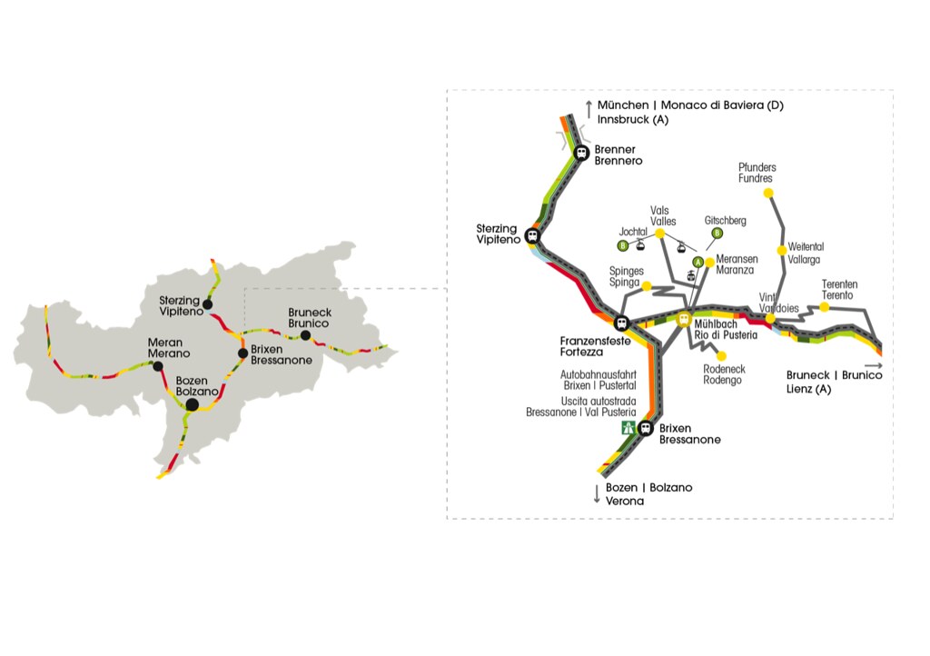 Oblast tvoří tři místa. Dole v Pusterském údolí (mezi 700 a 800 metry nad mořem), kterým projíždíte dál ke Kronplatzu, na Toblach a ku Tre Cime, leží správní městečko Mühlbach/Rio Pusteria. Už sem dojedete snadno i vlakem. Pokud nemusíte za každou cenu řídit, odtud vede „spojovací“ lanovka do Meransenu/Meranza, na sluneční terasu (asi 1400 metrů vysoko) s hlavní uličkou, ale pak jen rozesetými hotely a penziony. Nástupní místo do lanovek směr nejvyšší vrchol Gitschberg (2335 m), kde chtěli chystat i dvě sjezdovky přímo na míru pro olympijskou šampionku Ester Ledeckou.