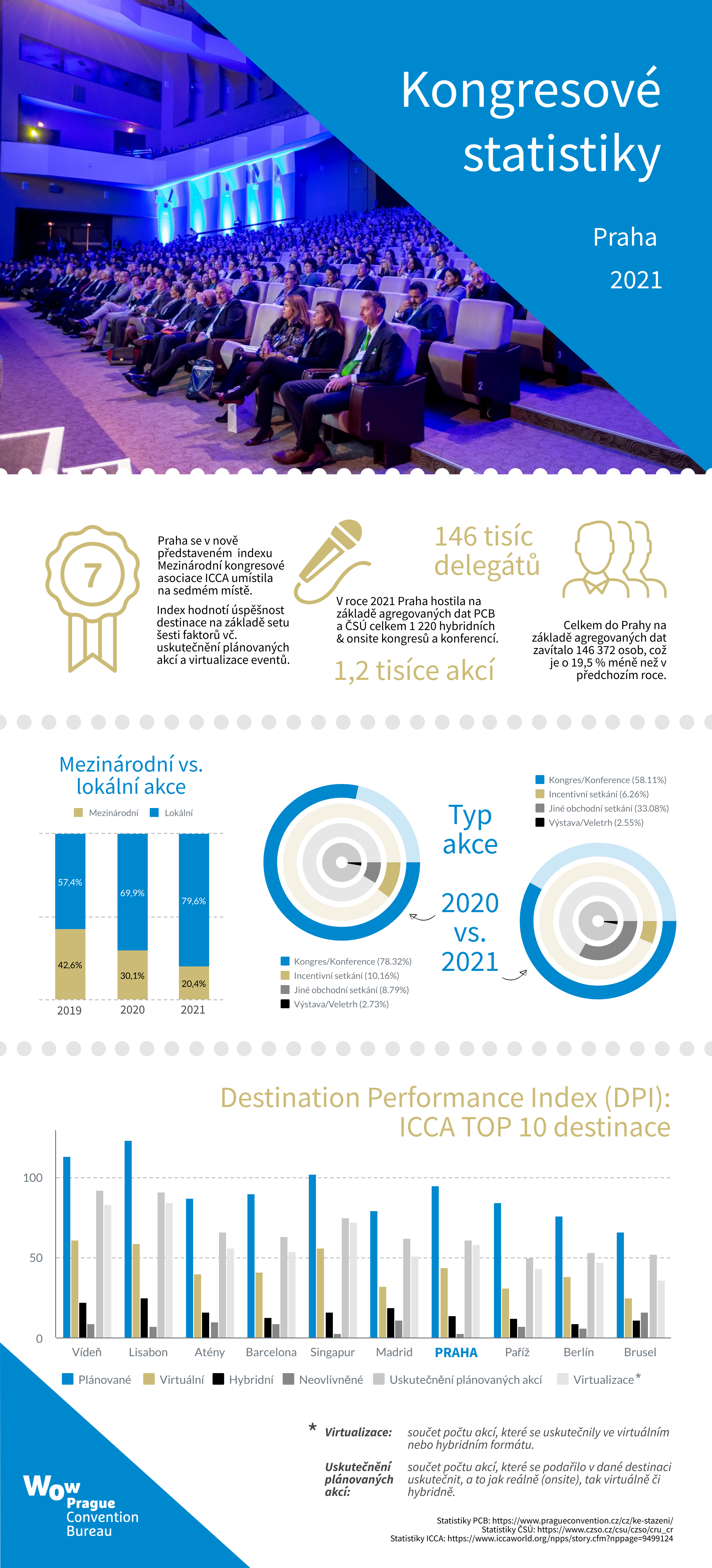 Pandemie covid-19 zasáhla v různé míře téměř všechny kongresové destinace světa. Mezinárodní kongresová asociace ICCA (International Congress & Convention Association) proto v letošním roce inovovala svůj dosavadní žebříček nejpopulárnějších kongresových destinací a vytvořila na základě několika setů dat nový Destination Performance Index (DPI). Ten v mezinárodním kontextu hodnotí destinace s ohledem na počet plánovaných, uskutečněných, virtuálních a hybridních asociačních akcí a od něj odvozenou úroveň virtualizace (připravenosti transformovat reálnou akci na virtuální či hybridní). Dalším hodnotícím kritériem je také uskutečnění plánovaných akcí (schopnost uskutečnit plánované eventy, a to jak ty probíhající reálně v destinaci – takzvané onsite akce, tak ty hybridní či plně virtuální).