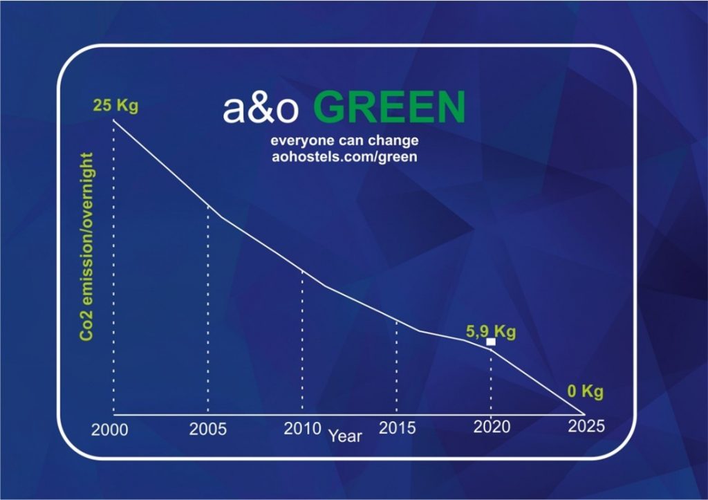 Cíl je jasný: do roku 2025 chce být a&o chce být ekologicky neutrální, jako první hostelový řetězec v Evropě. Již nyní společnost produkuje méně emisí než konkurence: a&o produkuje 6 kg oxidu uhličitého na jedno přenocování, což je zhruba o 75 % méně než jakýkoli jiný srovnatelný nízkonákladový hostel.