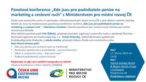 Česká unie cestovního ruchu ve spolupráci s Ministerstvem pro místní rozvoj ČR a pod záštitou veletrhu HOLIDAY WORLD & REGION WORLD vás zvou na moderovanou panelovou konferenci „Kde jsou pro podnikatele peníze na marketing a cestovní ruch“ s Martinem Jiránkem, hlavním poradcem pro cestovní ruch ministra pro místní rozvoj Ivana Bartoše.
