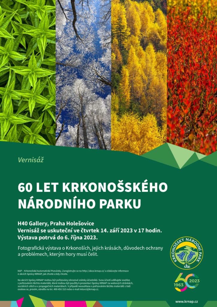 Výstava fotografií 60 let Krkonošského národního parku, kterou dosud mohli lidé vidět ve vrchlabském Krtkovi, dorazila do Prahy, do holešovické galerie H40. Návštěvníci se mohou těšit na více než osm desítek velkoformátových fotografií na plátně. Jedinečné fotografie představují krkonošskou krajinu, vzácné druhy rostlin a živočichů, ale také problémy, kterým musí náš nejstarší národní park čelit. Výstava, která je prodejná, potrvá do 6. října.