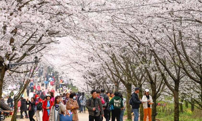 Se začátkem jara rozkvétá třešňová zahrada Kuej-an (Guian) v jihozápadní Číně o rozloze 24 000 mu (asi 1600 hektarů) miliony květin a přitahuje nespočet turistů.