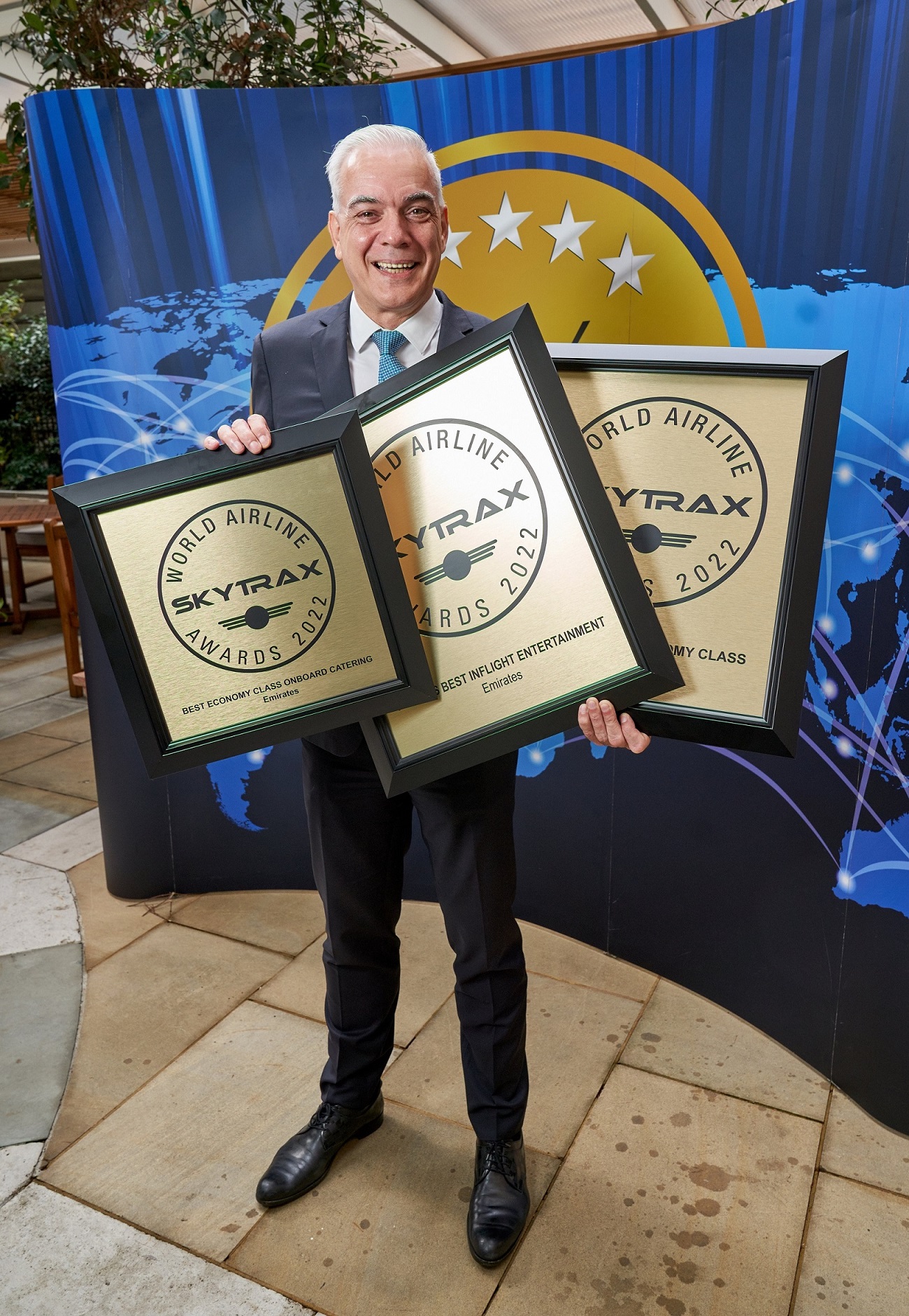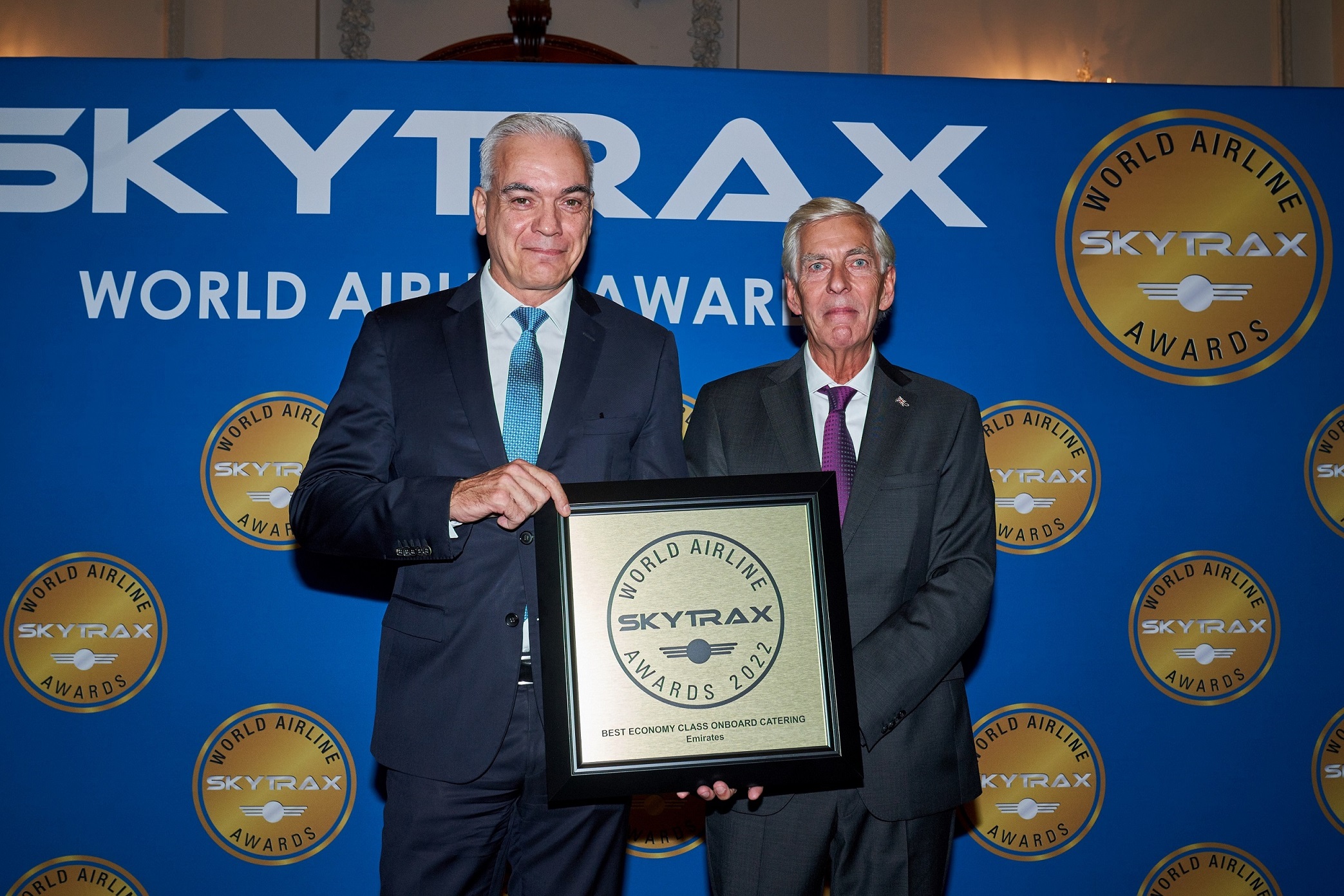 Letecká společnost Emirates získala tři ocenění Skytrax World Airline Awards 2022: ocenění za nejlepší Economy Class, nejlepší catering nabízený v Economy Class a již posedmnácté v řadě získala společnost také prvenství v kategorii nejlepší nabídka palubní zábavy na světě.