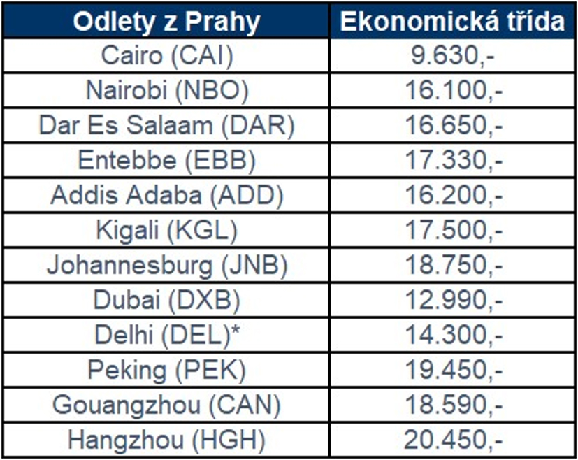Podrobné informace ve vašich GDS. Ceny jsou v CZK, vč. letištních tax ke dni 18. 4. 2024. *DEL na cestě zpět nutné přenocování v CAI, hotel a transfer zdarma vč. snídaně. Vízum do Egypta není potřeba.