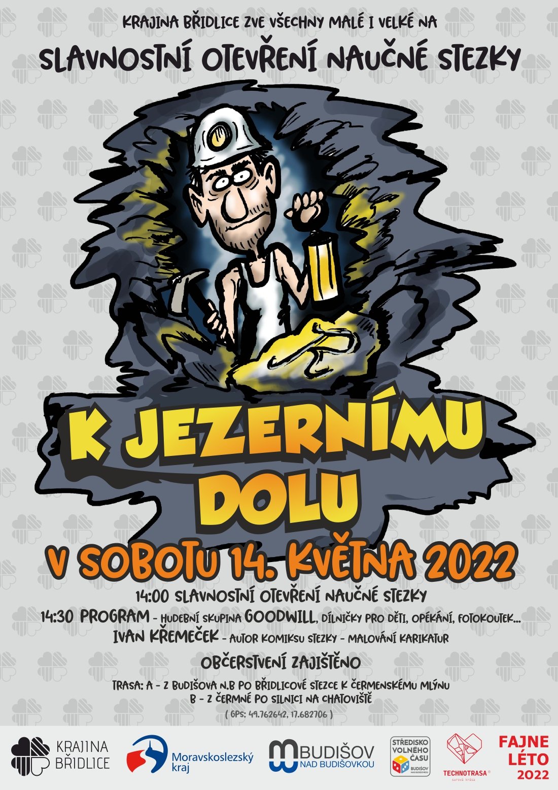 Fajne léto 2022 zahájí v sobotu 14. května od 14 hodin v Budišově nad Budišovkou otevření naučné stezky K Jezernímu dolu. „Jezerní důl je součástí Krajiny břidlice a je jediný, ve kterém se dá jezdit na lodičkách. Nová naučná stezka bude pro výletníky novým lákadlem a já doufám, že se její slavnostní otevření v rámci Fajneho léta vydaří. Pro návštěvníky bude připraveno opékání buřtů, dílničky pro děti, ukázky štípání břidlice, ale i koncert kapely. Součástí programu bude také představení Technotrasy, která sdružuje už 35 technických památek a atraktivit v našem kraji,“ řekl náměstek hejtmana Moravskoslezského kraje pro regionální rozvoj a cestovní ruch Jan Krkoška a doplnil, že kraj technické památky dlouhodobě podporuje, letos mezi 17 projektů rozdělil 3 miliony korun. Tyto prostředky šly hlavně na vylepšení expozic, zavádění nových technologií nebo zvyšování kvality služeb pro návštěvníky.