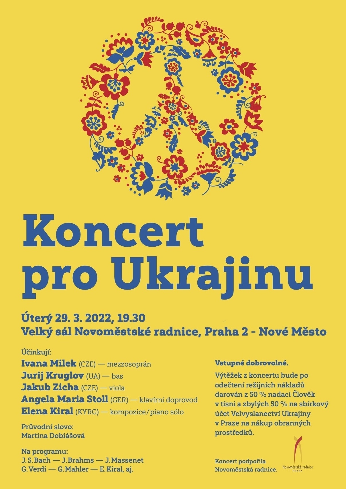 V úterý 29. 3. 2022 v 19:30 ve Velkém sále Novoměstské radnice v Praze 2 vystoupí osobnosti klasické hudby na benefičním koncertě na pomoc Ukrajině. Výtěžek koncertu bude rozdělen mezi Velvyslanectví Ukrajiny v ČR a sbírku nadace Člověk v tísni.