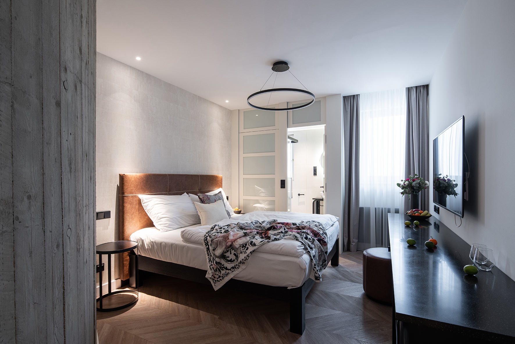 Interiér hotelu je nadčasový a nese se v moderním duchu, přesto však odkazuje i na minulost. Smíchov byl původně založen jako průmyslová čtvrť na pražské periferii, která se až postupem času proměnila v atraktivní lokalitu pro práci i bydlení a stala se součástí centrální části metropole. „Na míru navržený nábytek s lehkým industriálním nádechem je proto vzpomínkou na někdejší obyvatele domu, kteří byli v této dříve průmyslové čtvrti zaměstnáni. Vzhled interiéru je pak založen na spojení hladkých zakřivených linií černě lakované oceli s luxusní kůží a čistými bílými akcenty,“ uvádí Sean Clifton a dodává: „Na podlahách veřejných prostor jsou použity černobílé vzory inspirované historickými dekory keramických dlaždic nalezených v původní budově. V kontrastu k nim působí hlavní schodiště s autentickým zábradlím, na kterém vyniká tmavý terazzo povrch imitující kámen s přiznanou texturou. Hosté mohou do svých pokojů vystoupat buď po tomto schodišti, nebo využít nového výtahu, díky němuž je objekt kompletně bezbariérový.“
