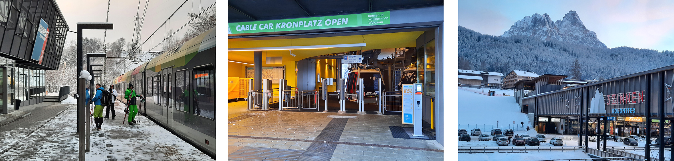 Na jednu stranu na Kronplatz se jelo dvacet minut. Z vlaku do lanovky to máte asi dvacet metrů. V dolní stanici Percha ani nemají velké parkoviště. Zato kvalitně vybavenou půjčovnu lyží a bot ano. Skipas si vyřídíte s předstihem (a slevou) po internetu, tady jen vytisknete z automatu kartu. Vystačíte tak po celý den vlastně jen s mobilem v kapse.