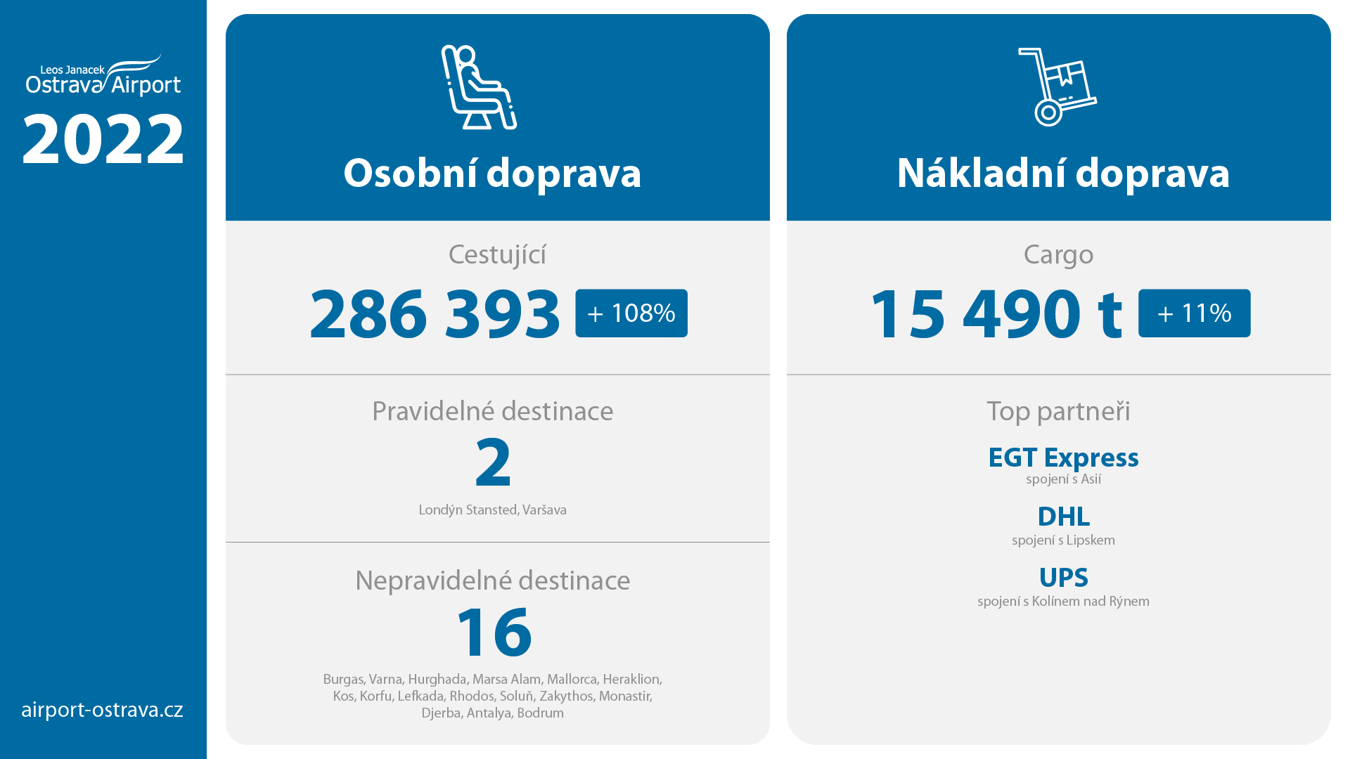 Celkově bylo z ostravského letiště v roce 2022 odbaveno 286 393 cestujících. Proti předchozímu roku se jedná o 108% nárůst. Zároveň je to jen o 11 % méně než v roce 2019 před pandemií covid-19, kdy bylo odbaveno přes 323 tisíc cestujících.