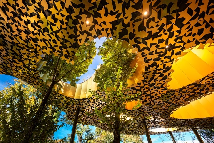 Velkolepou dominantou budovy je skleněná opona obklopující upravenou střešní zahradu na vrcholu dvou vzhůru zahnutých křídel. Tento prvek pokrývá rastrovaná kovová mřížka s etnografickými motivy vybranými z maďarských a mezinárodních sbírek muzea, která se skládá z téměř půl milionu pixelů, jež byly laserem vyryty speciálním robotem do hliníkových mřížek připevněných k budově.