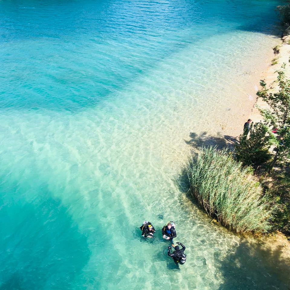 Pokud vás láká potápění, je pro vás Velké jezero ta nejlepší volba. Na své si zde přijdou jak naprostí začátečníci, kteří si mohou užívat atrakcí v hloubce do 20 m, tak pokročilejší potápěči, kteří mohou propátrat celé jezero v hloubkách 30–40 m a užít si tak i solidní dekompresní ponory. Většina atrakcí je blízko přístupu do vody v hloubkách do 30 metrů a jsou špičkově vyvázány včetně navigačních cedulek a šipek. Dno je zvlněné a pozorný potápěč může při jeho průzkumu ještě dnes spatřit stopy někdejší těžby korečkovými bagry. Pokud se ovšem jeho pozornost nesoustředí spíše na místní hojnou vodní faunu – jsou tu k vidění nejen známé druhy jako kapr, jelec tloušť, štika, sumec, candát nebo úhoř, ale i „tropicky“ zbarvená slunečnice pestrá.