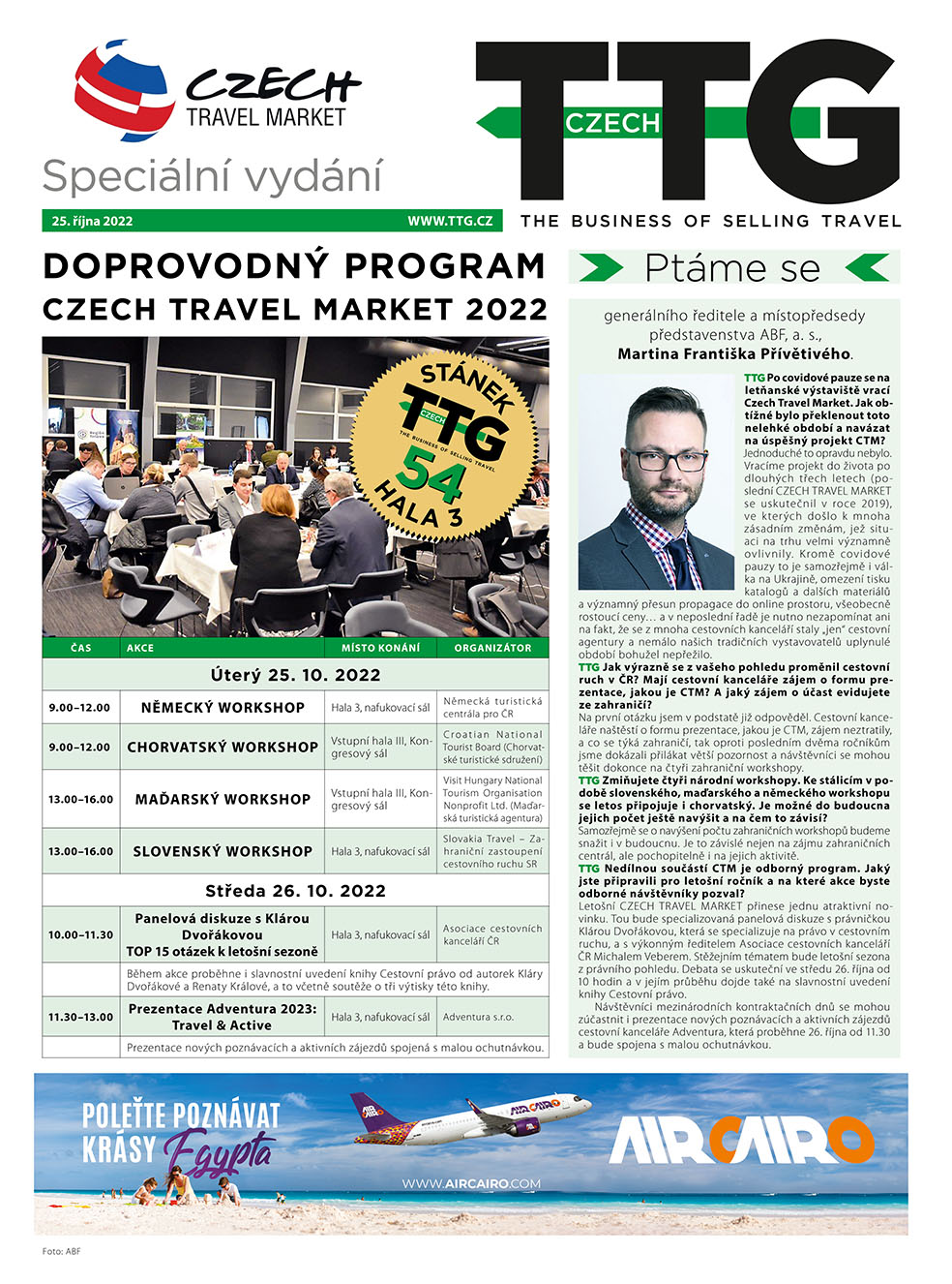I druhý den CTM probíhala intenzivní B2B jednání a přátelská setkání. Zleva: Na stánku Jamajky se potkali paní Jana Mitkovová, Sales Manager Discovery Travel, a Petr Bílek, Sales Expert CZ/SK/PL Jamaica Tourist Board. Martin Niklfeld, ředitel Blue Sky Travel/GSA Air Cairo, Vlastimil Dispo, Sales Manager GSA Air Cairo, Mona Omar Fahmy, Europe Sales Manager Air Cairo. / Foto: Vlaďka BratršovskáTým CK ATIS byl na CTM v početném obsazení. / Foto: archiv CK ATISNa stánku Anchoice zleva Dominik Hašek, technická podpora uživatelů systému Anchoice, Martin Krčmář, ředitel společnosti Anchoice, a Petr Krč, ředitel CK ATIS. / Foto: Vlaďka BratršovskáLeteckou společnost Eurowings zastupoval pan Björn Gianotten, sales manager Eurowings pro ČR. / Foto: Vlaďka BratršovskáVeletržní vydání TTG Czech bylo návštěvníkům k dispozici po oba dny CTM. Během workshopů, na stáncích vystavovatelů i na registraci odborných návštěvníků a novinářů. Čtenáři ocenili, že získali všechny informace o CTM a profily některých vystavovatelů na jednom místě a v ucelené podobě. / Foto: Vlaďka Bratršovská