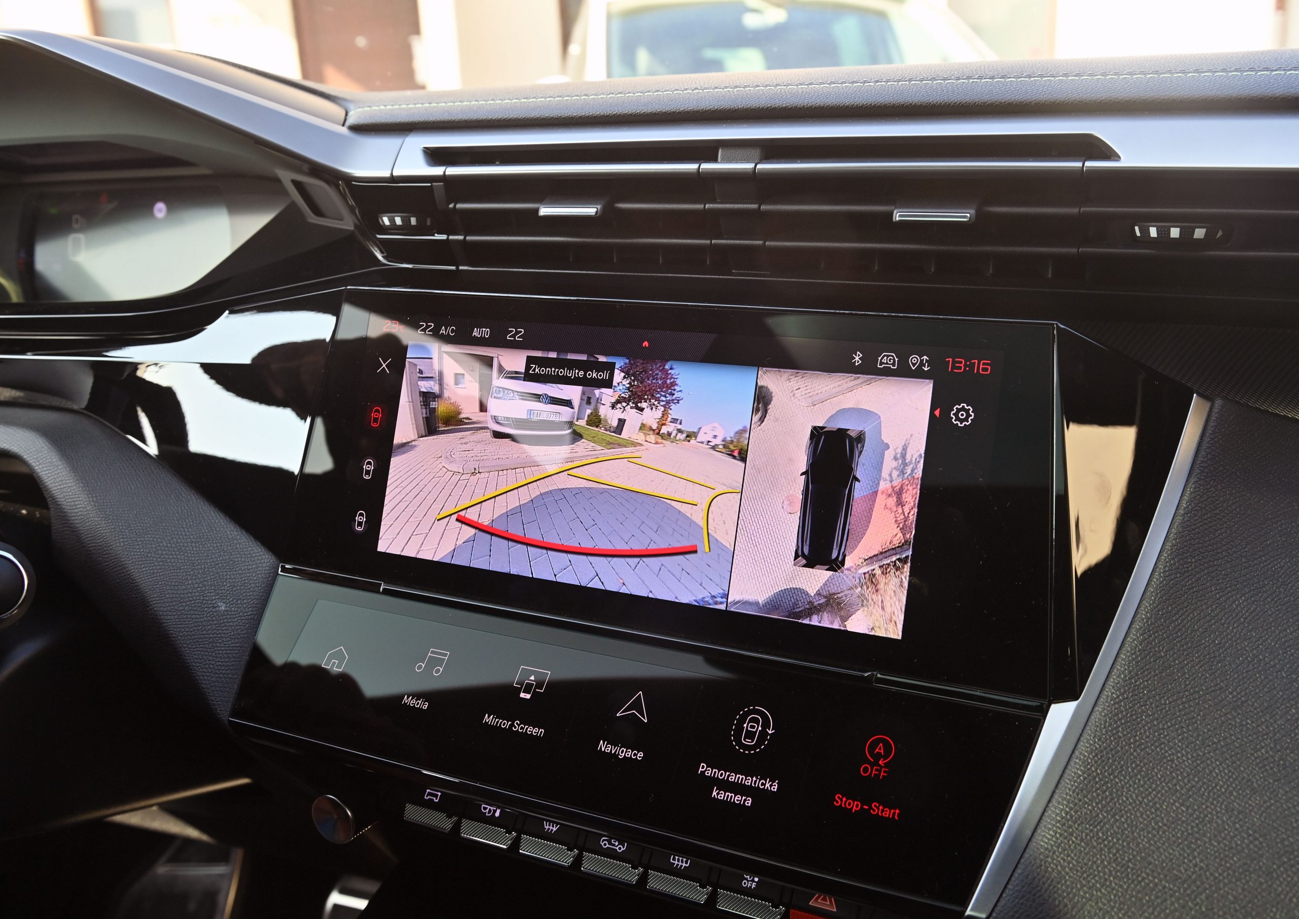 Desetipalcový přístrojový dotykový panel nabízí velmi příjemnou velikost i přehlednost zobrazovaných údajů i s přepínáním „tak akorát“. Ty hlavní se u GT zobrazují (pokud chcete) i jako trojrozměrný hologram přímo před očima. Při parkování oceníte čtyři kamery (zadní i s ostřikovačem) s panoramatickým záběrem 360 stupňů i automatické sklápění zrcátek při couvání. Bezpečnostní artilerie s řadou prvků včetně trhnutí s volantem, pokud nedáte správně blinkr, už je samozřejmostí. Na signalizaci blížícího se vozidla zářivkou ve zpětném zrcátku se zvyká až nadšeně. Podobně na automatické udržování rychlosti podle rychlosti auta před vámi nebo sklonu zatáčky.