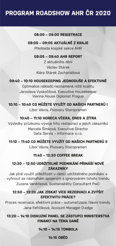 Budeme se zabývat připravovanou legislativou, vývojem trhu restaurací, jak díky udržitelnosti získat klienty, online marketingem a mnohým dalším. Diskusní panel bude zaměřen na daně a Vy se budete moci zeptat na cokoliv, co Vás zajímá.