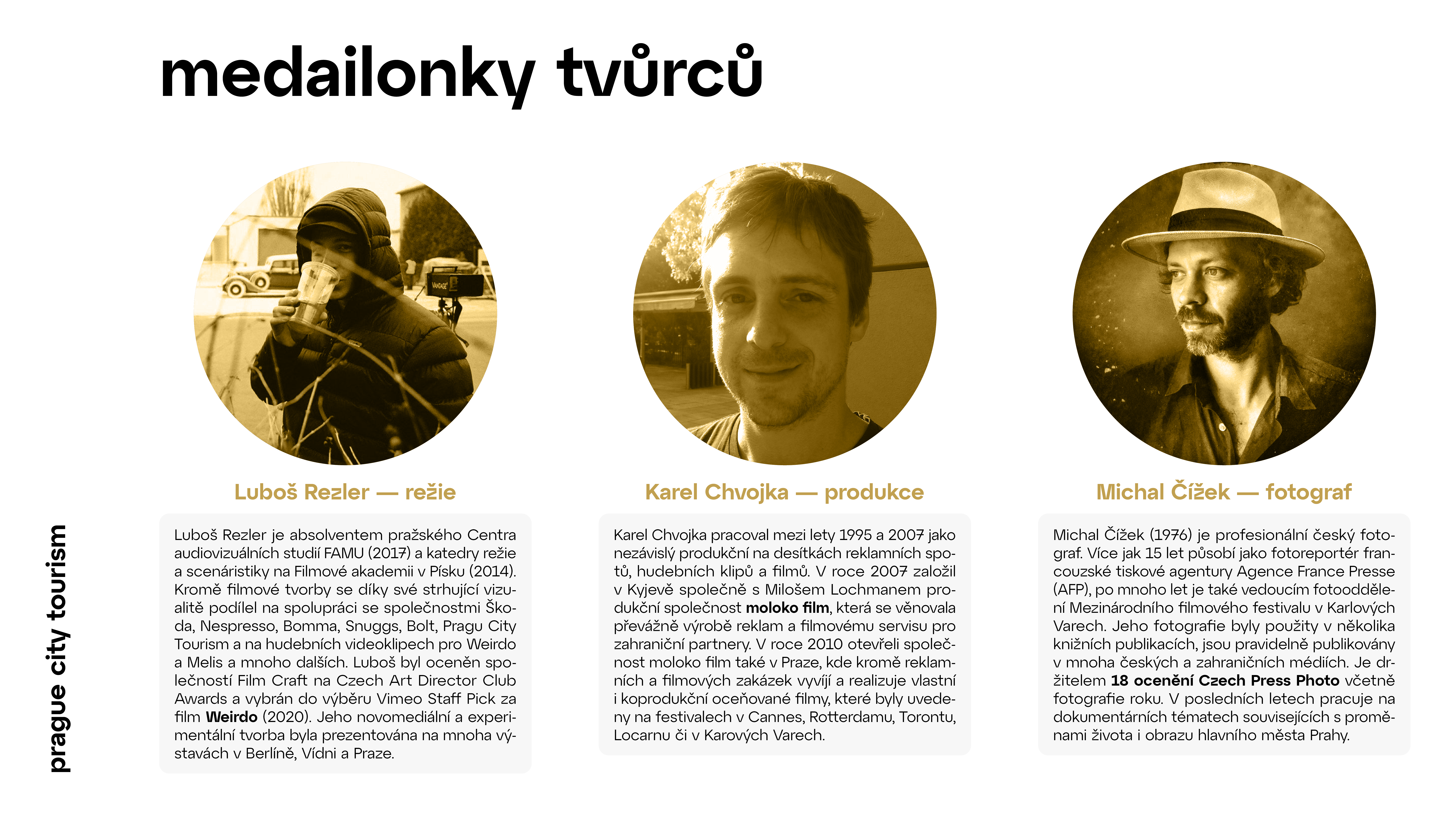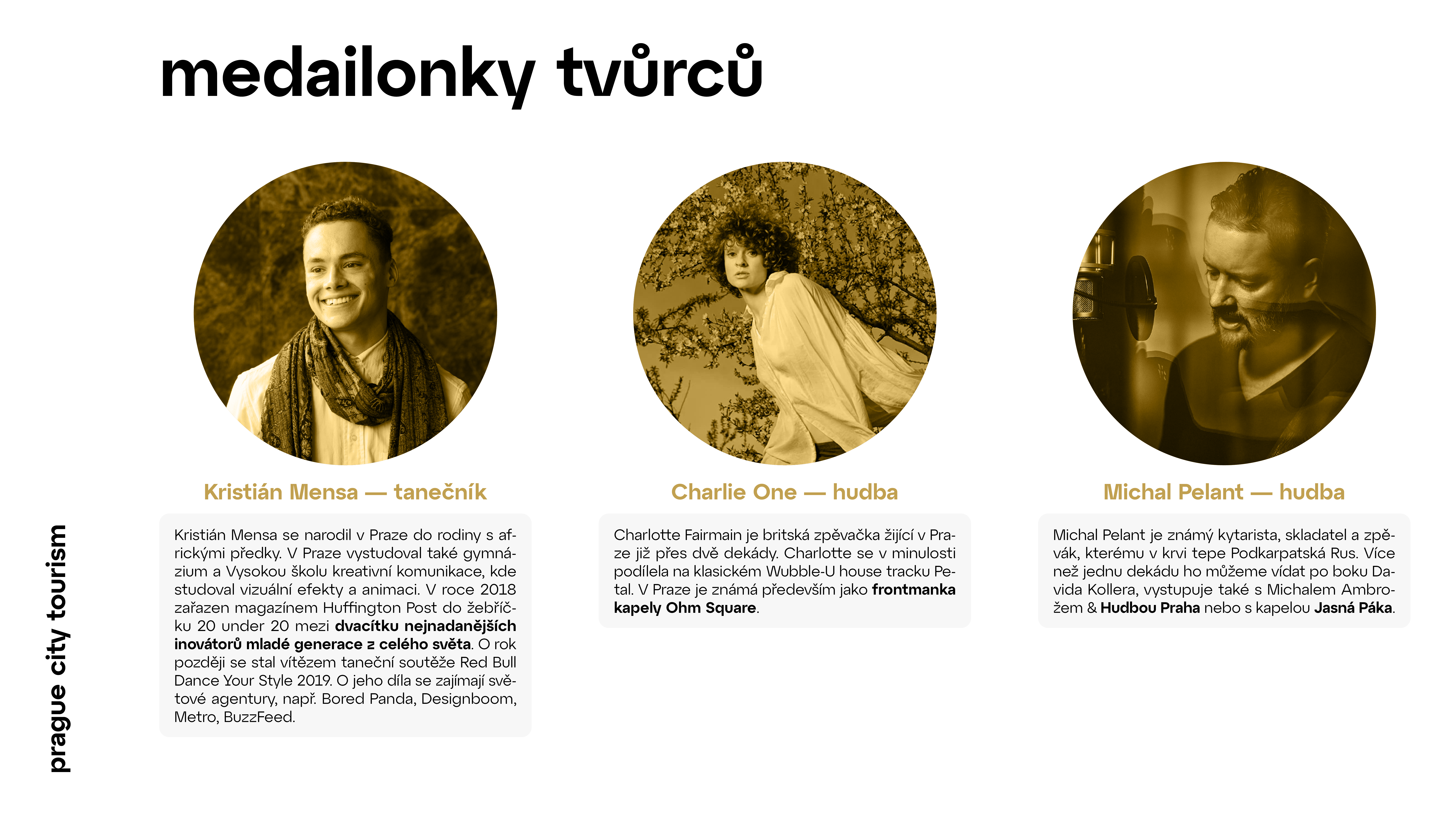 Společnost Prague City Tourism pro spolupráci tradičně oslovila významné lokální tvůrce, které zapojuje do všech svých marketingových aktivit. “Prahu s hrdostí prezentujeme prostřednictvím pražských umělců. Tváří letošní kampaně je talentovaný tanečník break dance Kristián Mensa, který svou choreografií složil poctu break dance jako novému olympijskému sportu,” říká místopředsedkyně představenstva Prague City Tourism Jana Adamcová.