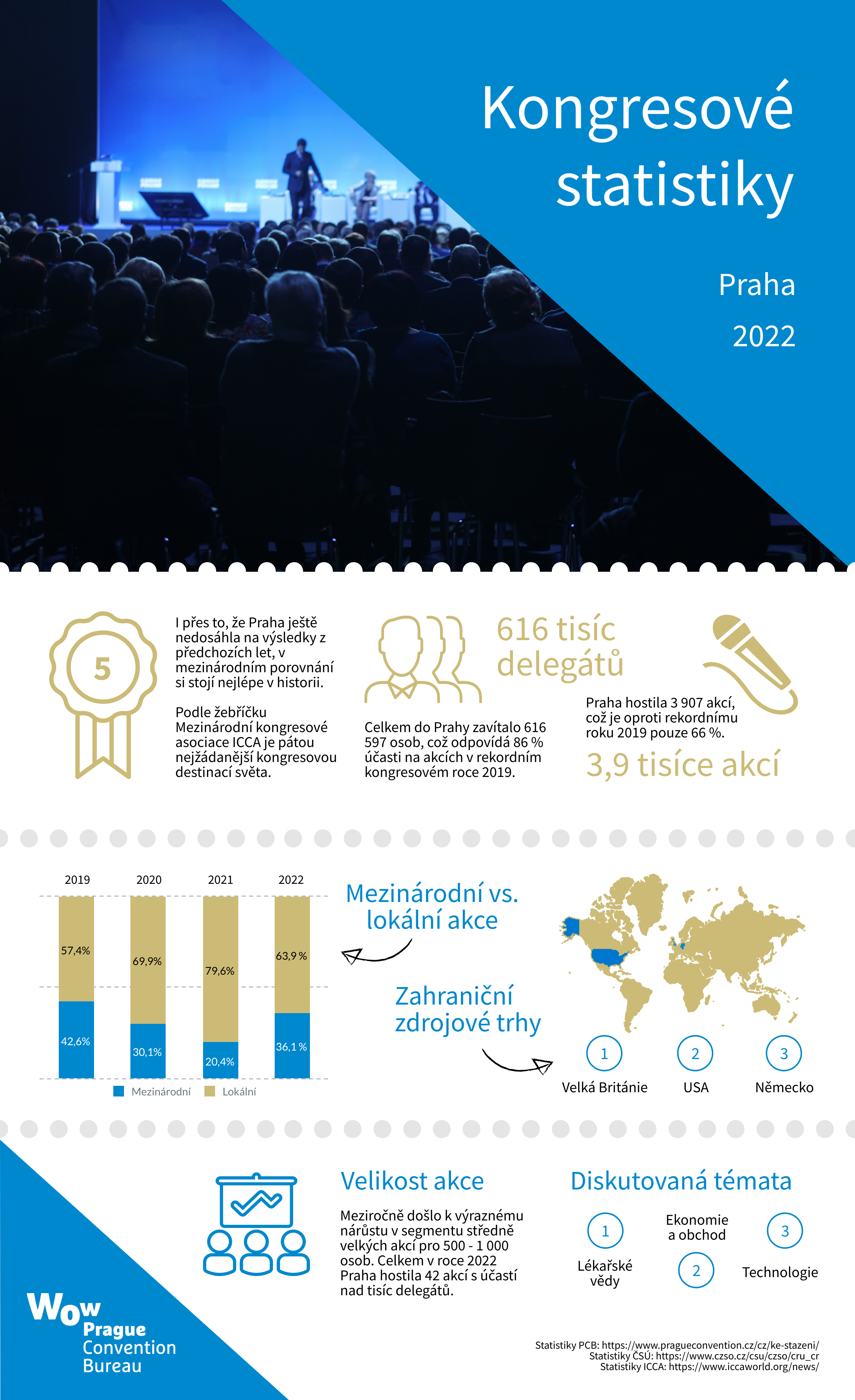 Praha v loňském roce přivítala podle agregovaných dat Českého statistického úřadu (ČSÚ) a Prague Convention Bureau (PCB) téměř čtyři tisíce akcí s 616 000 delegáty. Ačkoliv se oproti pandemickým rokům jednalo o přírůstek v hodnotě několika stovek procent, kongresová Praha se zatím zdaleka nepřiblížila rekordním rokům 2018 a 2019. V mezinárodním srovnání si však polepšila. V žebříčku nejžádanějších kongresových destinací světa Mezinárodní kongresové asociace ICCA se česká metropole za rok 2022 umístila na pátém místě. Za sebou nechala Madrid, Berlín, Atény, Brusel i Londýn.