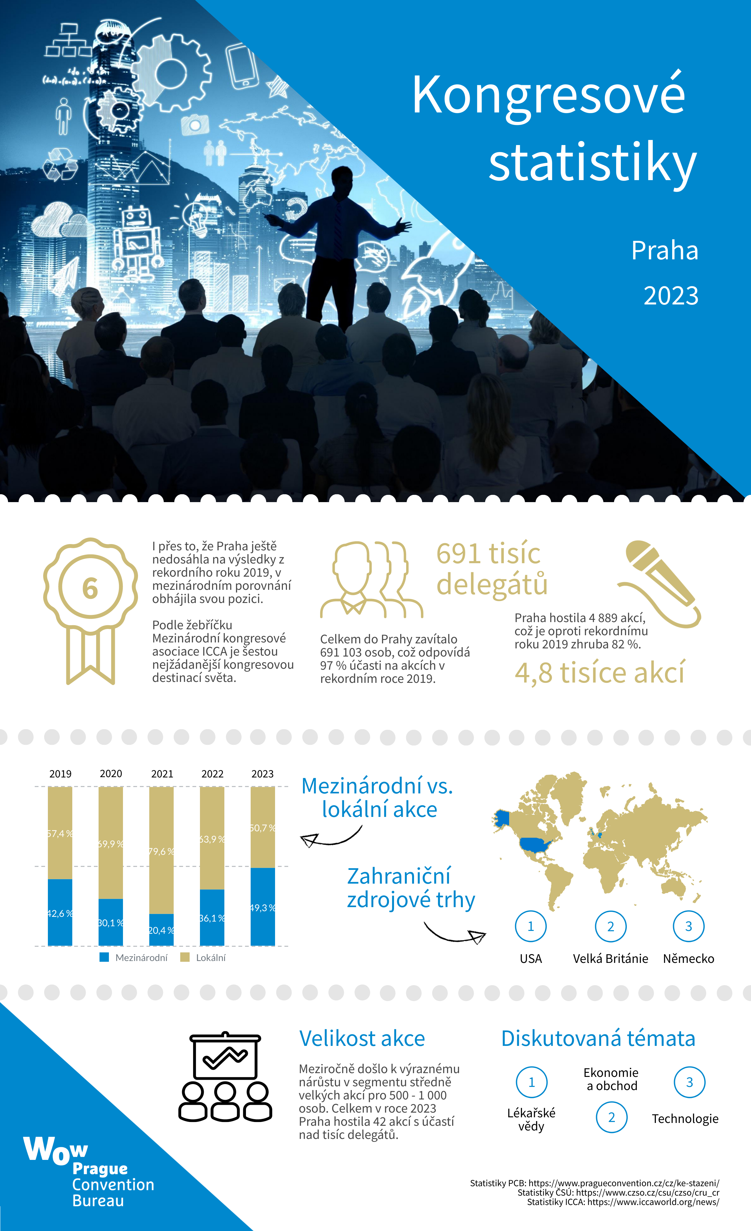 Praha si ve svých strategických dokumentech zaměřených na cestovní ruch stanovila cílení na bonitní klientelu, a to i prostřednictvím kongresových delegátů. Ti totiž nejenže destinaci nezatíží v hlavní turistické sezoně, protože kongresy se nejčastěji konají na jaře a v podzimních měsících, ale zároveň mají v průměru až trojnásobně vyšší útraty oproti běžnému turistovi. Získávání kultivované klientely se daří i díky návratu zahraničních odborných akcí do Prahy. Dle dat Prague Convention Bureau meziročně vzrostl počet zahraničních kongresů a konferencí v Praze o 54 %, a podařilo se tak opět vyrovnat poměr zahraničních (49,3 %) a lokálních akcí (50,7 %). „Nejvíce akcí k nám tradičně míří z evropského kontinentu (88,5 %). Nicméně pokud se zaměříme na jednotlivé země, tak v roce 2023 se na první příčku zdrojových zemí vrátily po čtyřech letech Spojené státy americké, které následovala Velká Británie, Německo, Francie a Belgie,“ upřesňuje Roman Muška. Mezi nejčastější témata, která do Prahy přijíždějí delegáti diskutovat, dlouhodobě patří lékařské vědy, ekonomie, finance a obchod a IT a technologie.