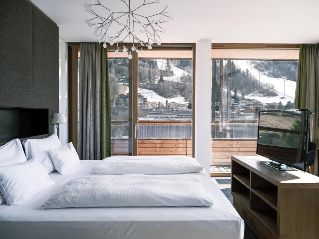 Na první pohled zaujme už jeho moderní architektura s alpskými akcenty z dílny známého studia Hohensinn Architectur, dřevěná fasáda, rozlehlé prosklené plochy s dokonalými výhledy i velkorysé terasy apartmánů. Nejluxusnější Dachstein suite zaujme krbem a koženým sofa, v Hochgolling suite najdete i efektně umístěnou vanu přímo uprostřed pokoje a taky privátní saunu.