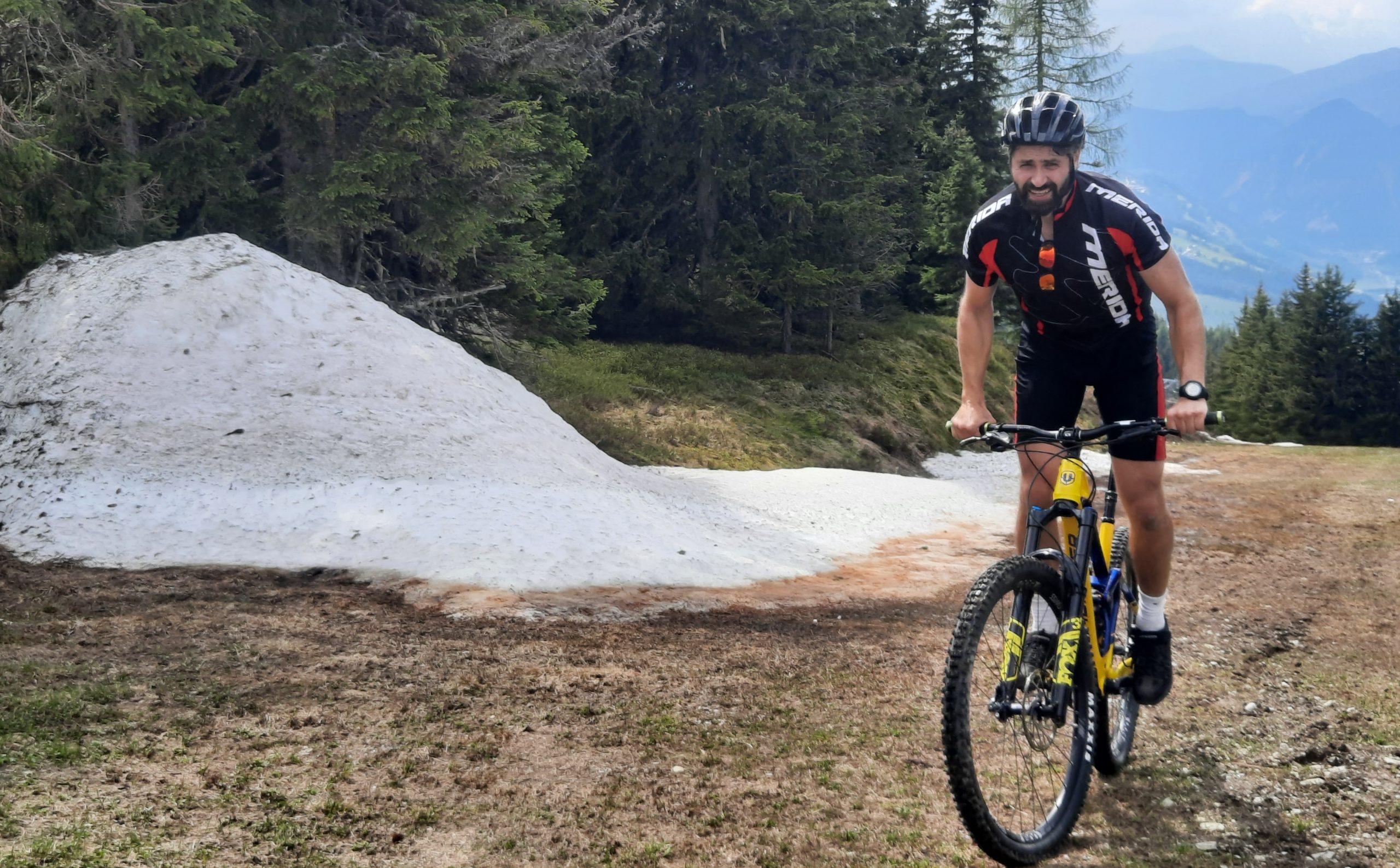 Jenže ještě teď v polovině června ji pokrývá objemná vrstva husté splihlé a černé trávy, která se právě dostala na světlo po půlročním pobytu pod sněhem. Znáte to, brodí se přes ni obtížně chůzí, natož na kole. A okrajovými tvrdšími stopami mezi kameny zurčí pramen vody ze sněhu tajícího nahoře. Sklon je tak akorát na hraně a tenhle poslední úsek, končící plochou starého špinavého sněhu, to uhrál s naší partou na remízu. Tedy dva, z toho jeden za podpory elektra, vyšlápli. A dva šli kus po svých, tlačíce kolo.