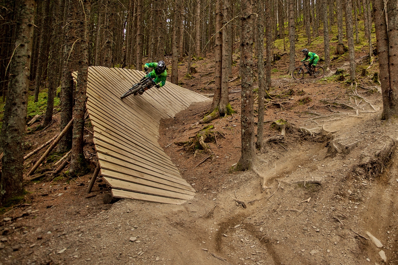 V obou případech se dostanete do stejného místa a pokračujete vzhůru lesem. Flow trail uphill, přiznám se, jsem dosud neslyšel. Ale zalíbí se mi hned. Pohupujete se, šlapete, ale stoupáte. A jen mezi stromy sledujete další bikery, spouštějící se v jiných lajnách dolů. Následuje kus širší traverzové cesty. A nakonec zbývá poslední úsek sjezdovky.