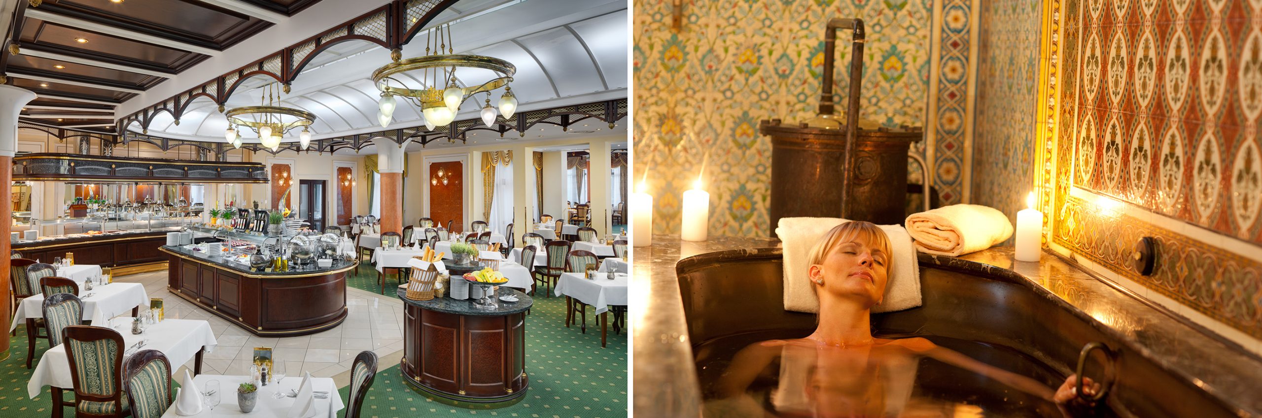 Zážitek z široké palety wellness procedur umožňuje fascinující historické prostředí. V dochovaných Římských lázních čekají na hosty dva původní bazény z roku 1896. Kromě nich tu však najdou také bazén s protiproudem, whirlpool, 2 sauny (90 °C), sanarium (60 °C), parní lázeň (85 °C), Kneippovu terapii, ochlazovací bazének, fontánku s ledovou tříští a relaxační místnost k odpočinku. Zcela výjimečná je pak minerální koupel a relaxace v královské kabině Edwarda VII. nebo v Císařské kabině rakouského monarchy Franze Josefa I. Habsburského. Na své si přijdou také golfisté, kteří mohou okusit svůj um na prvním golfovém hřišti u nás. Založeno bylo před víc než 100 lety a dnes je spravuje klub, který má britskou královnou Alžbětou II. povoleno užívat název královský – Royal Golf Club Mariánské Lázně.