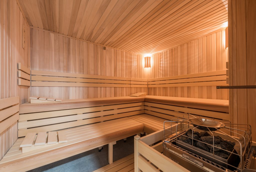 K dispozici je také zážitková sprcha s tryskami, chrličem a ochlazovacím kyblíkem či odpočívárna s křesly a lehátky.