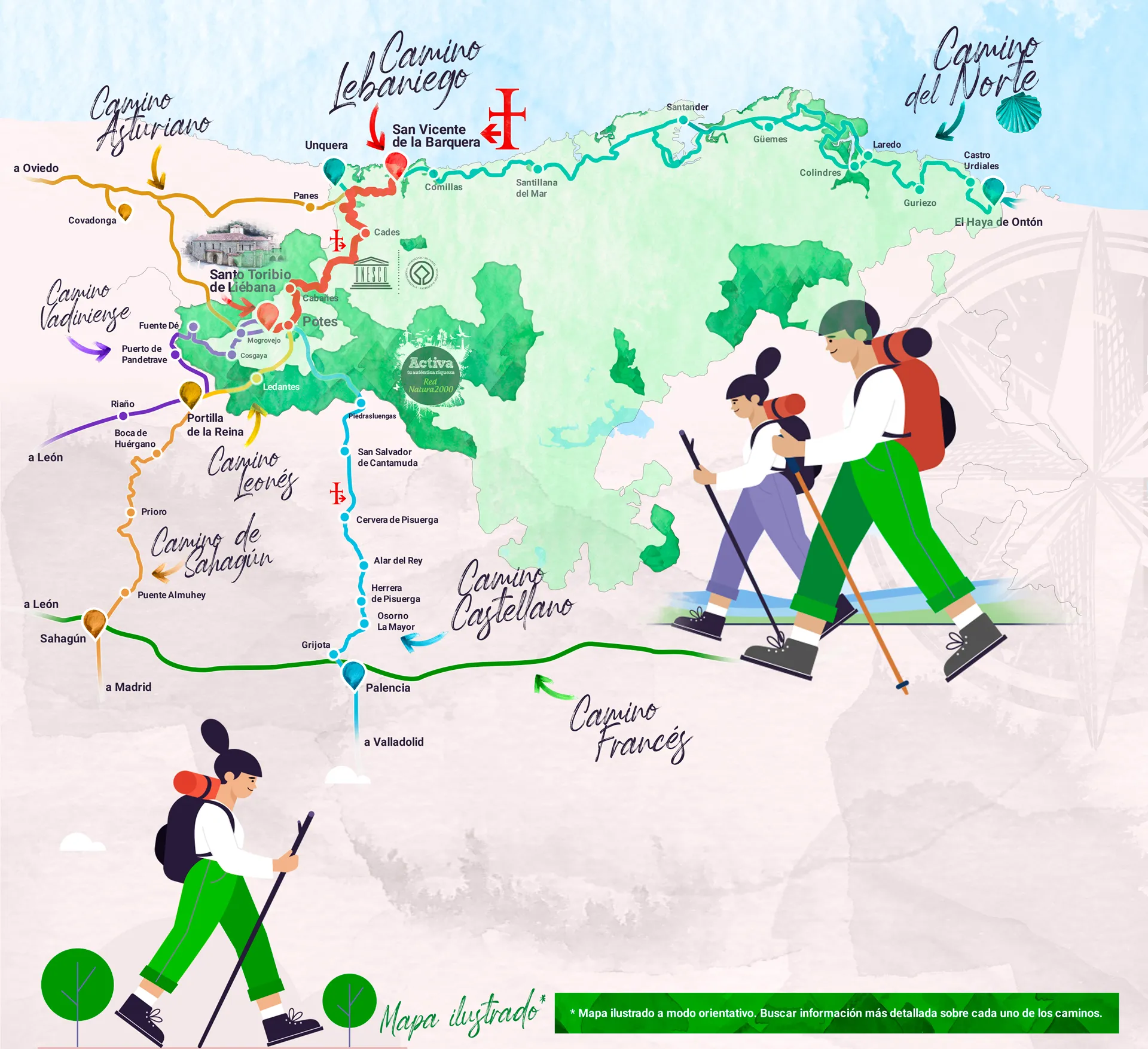 Kudy trasa prochází? Členitý terén pohoří Picos de Europa a Kantaberského pohoří geograficky ohraničuje údolí Liébana a podmiňuje přístup do Santo Toribio ze sousedních oblastí, Asturie, Kastilie a Leónu. Existují četné historické zmínky o existenci čtyř hlavních poutních cest do kláštera Santo Toribio. Tyto cesty, které jsou v poslední době v rámci sítě pěších stezek v Liébaně označovány jako PR (trasy krátkých vzdáleností), vedou různými oblastmi podle výchozího místa.