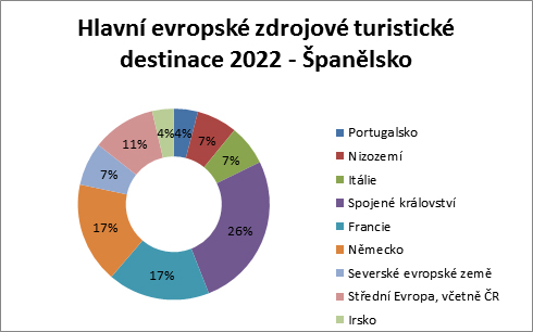 Na prvním místě se zcela jednoznačně umístilo Spojené království se 14,358 milionu turistů, za ním pak Francie s 9,426 milionu, která však má výhodu blízkých hranic a přeshraniční turistiky, obdobně jako Portugalsko s 2,22 milionu. Velmi dobře si vedly Itálie a Nizozemí, obě země „vyslaly“ do Španělska kolem 3,7 milionu turistů, a také státy evropského severu s 3,99 milionu. Procentuálně se nejvíce snažilo Irsko (247 % oproti 2021) a Spojené království (269 % oproti 2021). Z ostatních výše jmenovaných destinací stojí za to jmenovat procentuální nárůst o 78 % v případě Francie a o 93 % u Německa. Evropské země zahrnované podle španělského statistického úřadu do kolonky “Ostatní”, kam patří i Česká republika, dosáhly za období leden–listopad 2022 počtu 5,88 milionu turistů, tedy o 108 % více ve srovnání s rokem 2021.