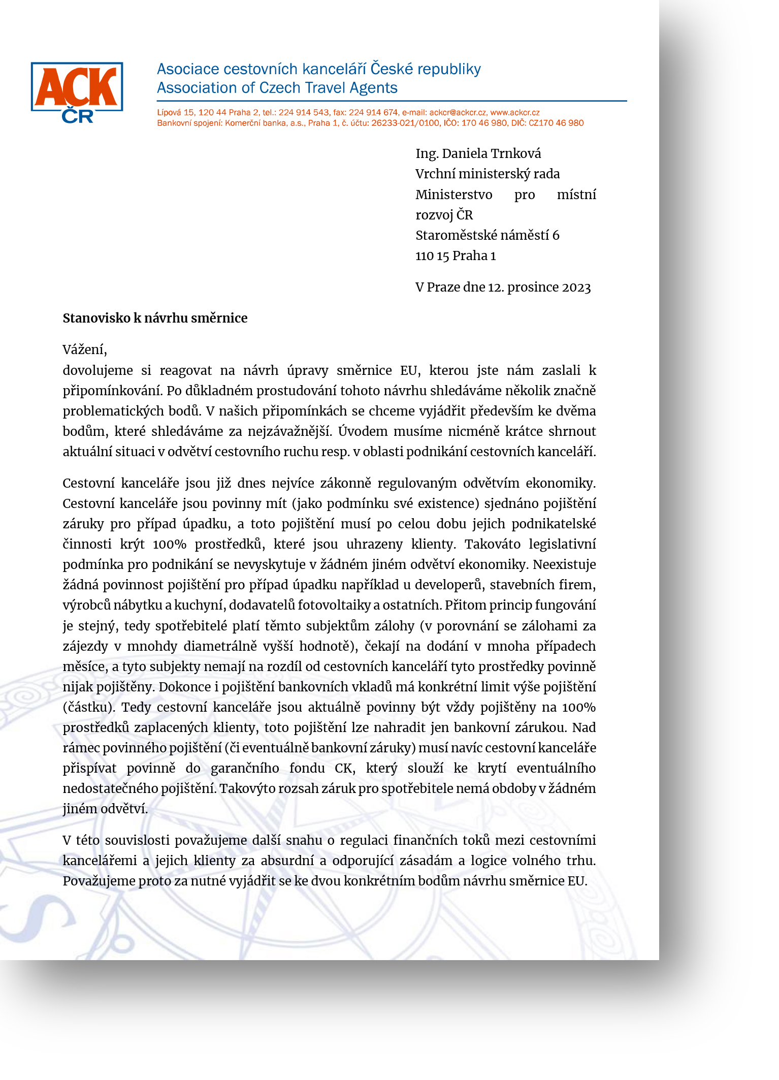 Návrh textu revize směrnice obdržela ACK ČR od Ministerstva pro místní rozvoj ČR a zároveň byla požádána o zaslání stanoviska k předloženému návrhu revize směrnice (pro účely zpracování rámcové pozice ČR). Místopředseda představenstva a předseda touroperátorské sekce Zdeněk Kříž sleduje tuto problematiku dlouhodobě a stanovisko ACK ČR odeslal na MMR ČR. Text stanoviska ACK ČR i text směrnice uveřejňujeme v plném znění. Pro přečtení klikněte na vybraný dokument.