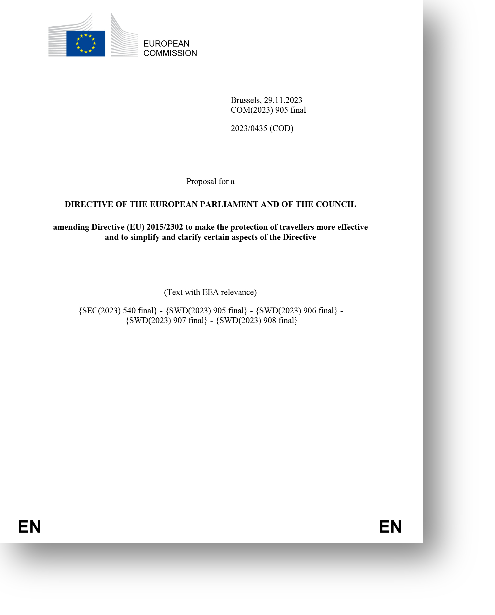 Evropská komise dne 29. listopadu 2023 předložila návrh směrnice, kterou se mění směrnice o souborných cestovních službách a spojených cestovních službách (2015/2302).