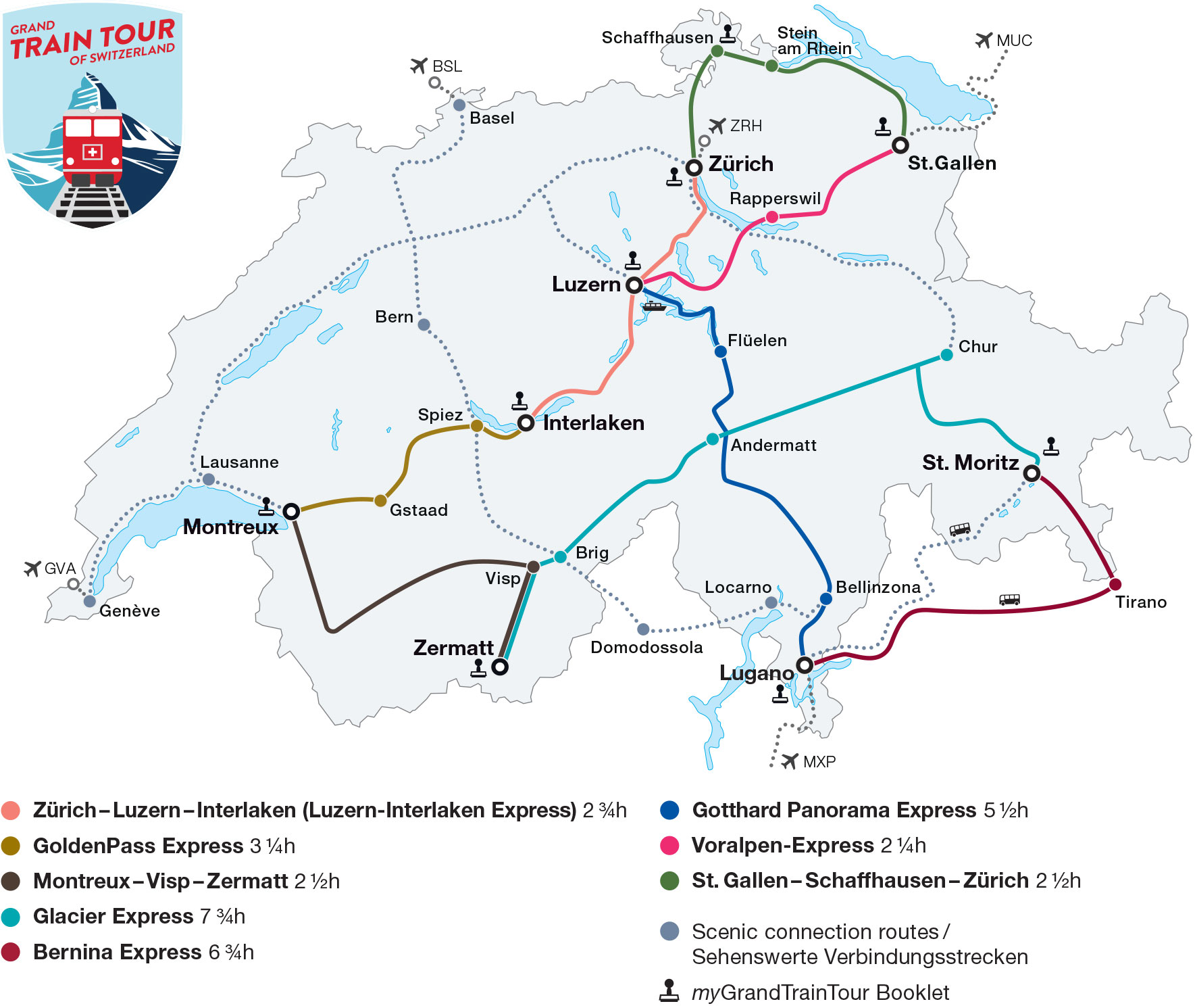 Na Grand Train Tour of Switzerland (GTTS) je možné nastoupit ve kterékoli stanici na trase. Osm etap celé Grand Train Tour lze s přehledem absolvovat za osm dnů. Na důkladný, neuspěchaný prožitek z celé cesty v duchu zásad „Swisstainable“, si však vyhraďte nejméně dva týdny. Pokud nemáte k dispozici dva týdny, je pochopitelně možné vydat se jen na některý úsek trasy. Než mít všechno odškrtnuto je mnohem lepší si zvolit si jen část velké cesty a především volnější tempo, které umožní hlouběji vnímat a důkladněji poznat okolí. Během zastávky je možné se kupříkladu vypravit na některou ze speciálně doporučených 21 horských túr. Mezi ně patří například výstup na Gornergrat, odkud se lze kochat výhledem na vždy bílé štíty Matterhornu nebo Titlisu.