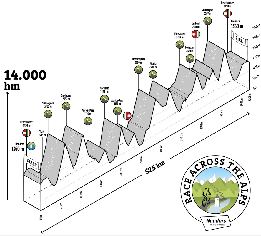 Race Across The Alps je po právu označovaný za nejtěžší jednodenní závod na světě. Trasa vedoucí na území Rakouska, Itálie a Švýcarska měří 525 km a závodníky potrápí neuvěřitelnými 14 500 výškovými metry. Závod překonává řadu ikonických alpských stoupání: hned dvakrát se jede přes Stelvio (2797 m), dále následují Gavia (2652 m), extrémně strmé Mortirolo (1846 m), Bernina Pass (2330 m), Albula (2036 m), Fluela (2399 m), Ofenpass (2149 m), Umbrail (2501 m) a Reschenpass (1450 m). Závod se jede výhradně s doprovodným vozem, a tak Dana během závodu podpoří i jeho bratr Martin a kamarádi z Ultra Paka Racing Teamu.