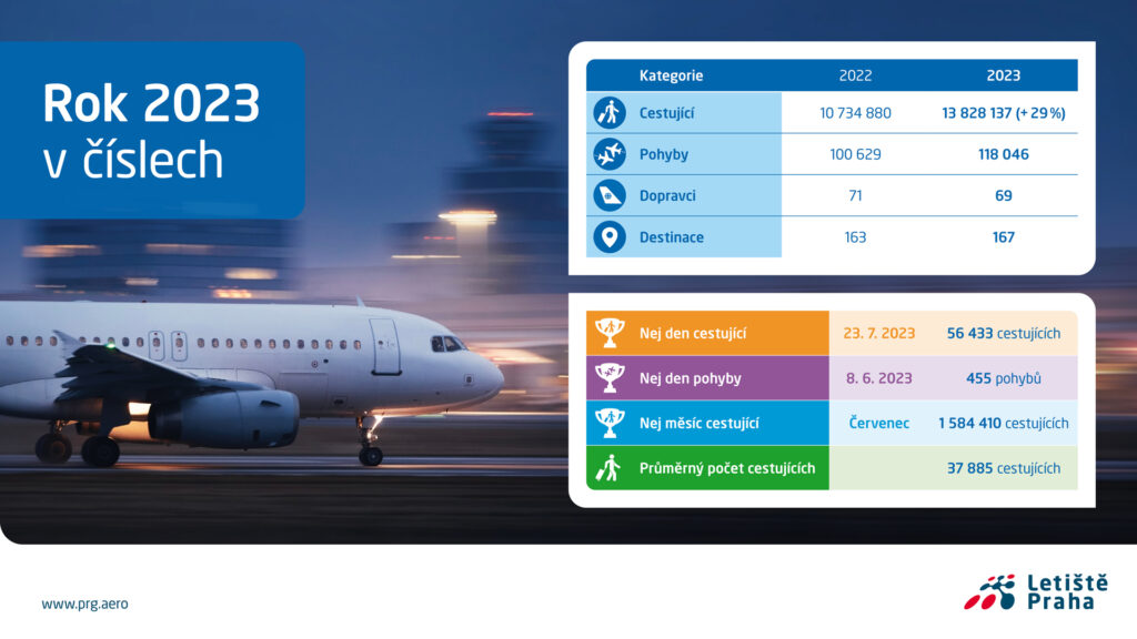 Předseda představenstva Letiště Praha Jiří Pos řekl, že se letiště v roce 2023 přiblížilo počtu odbavených cestujících z roku 2019. Konkrétně se jejich počet vyšplhal na 78 procent. „V rekordním roce 2019 se z Prahy létalo do 190 destinací, v roce 2023 jsme se dostali na číslo 167. Zároveň se nám podařilo obnovit nebo spustit několik dálkových linek, například do jihokorejského Soulu s dopravcem Korean Air nebo s China Airlines na Tchaj-wan. Dalším nesporným posunem jsou pro nás charterové dálkové lety dopravců LOT Polish Airlines a World2Fly, kteří nabízejí přímé lety do exotických dovolenkových destinací jako Dominikánská republika, Thajsko či Srí Lanka. To vše jsou pro nás velmi významné úspěchy, které nás neustále přibližují k nejúspěšnějšímu roku 2019.“