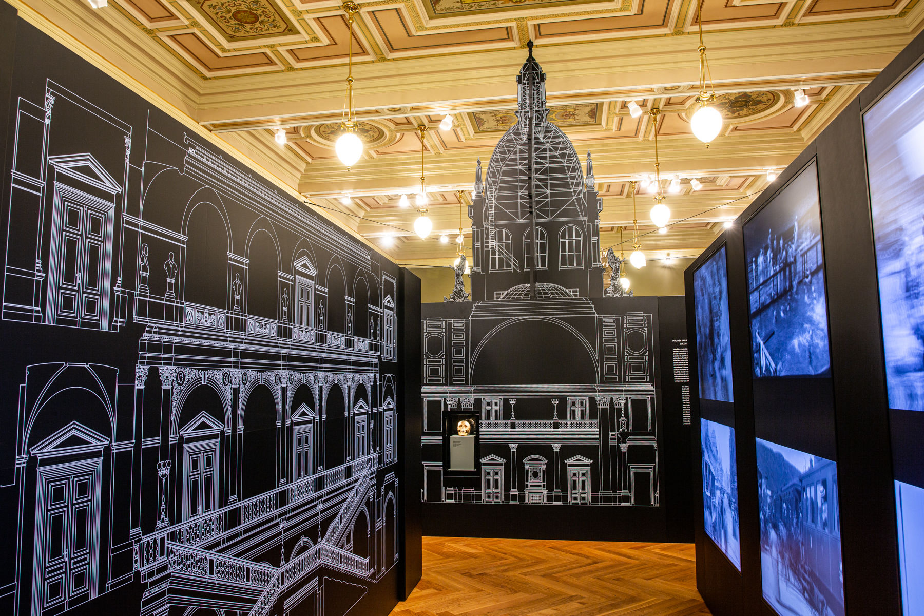 V jednotlivých sálech expozice návštěvník rozhodně nepřehlédne jejich architektonické dominanty. Po vstupu do prvního sálu ho ohromí velká obranná zeď středověkého hradiště, do jejíž druhé strany jsou zabudovány vitríny s ukázkami impozantního bohatství středověkých archeologických nálezů z českého území. Ve stejném prostoru se pak nachází také stavba rotundy s tématem příchodu křesťanství. V dalším sále je dominantní kompozice obrovského kříže demonstrujícího náboženský konflikt mezi katolictvím a protestantstvím. Pro navození atmosféry baroka byla v následujícím sále vytvořena stylizovaná kaple s ukázkami sochařského umění své doby. V dalším prostoru je zcela nepřehlédnutelný kočár pražského arcibiskupa Viléma Florentina ze Salm-Salmu znázorňující symbol tehdejší technické vyspělosti a dynamiky. Vrchol této práce s architektonickými prvky pak návštěvník nalezne v poslednímu sálu 19. století, kterému dominuje velký model budovy Národního muzea, instituce, která sehrála významnou roli v našich dějinách a ovlivnila jejich vývoj. Z něj pak návštěvník vejde do monumentálního Panteonu Národního muzea, aby se rozloučil s obdobím monarchie a vykročil do 20. století, jehož expozici najde v Nové budově Národního muzea.