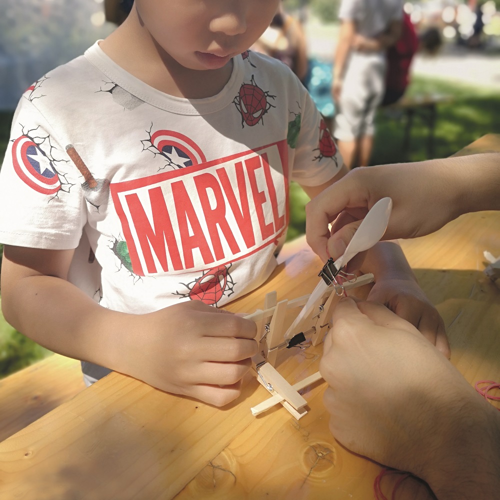 Například v experimentu “Létající mísa na vejce” děti postaví ochrannou konstrukci kolem vejce a pak ho nechají spadnout na zem z výšky nejméně 2 metrů. Bez ohledu na to, zda je výsledkem neporušené vajíčko, nebo vaječná mísa – maximální stavební zábava je zaručena!