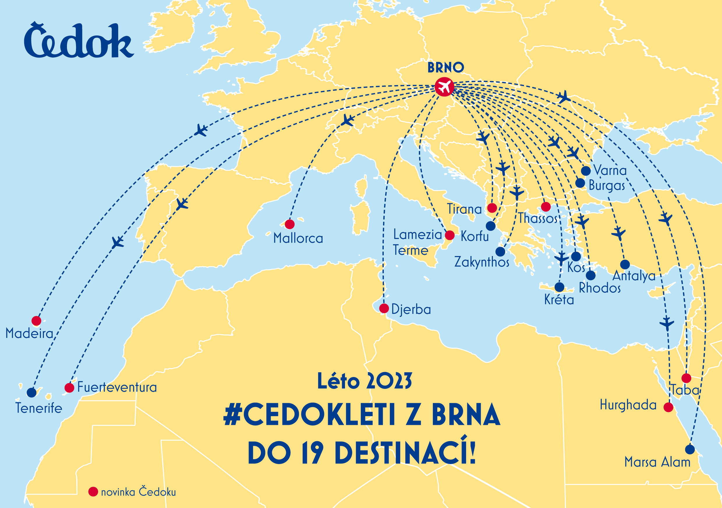 Přehled destinací Čedoku z Brna v letní sezoně 2023: Antalya (Turecko), Burgas (Bulharsko), Djerba (Tunisko), Fuerteventura, Mallorca, Tenerife (Španělsko), Kavala (Thassos), Korfu, Kos, Kréta/Heraklion, Rhodos, Zakynthos (Řecko), Lamezia Terme (Itálie), Madeira (Portugalsko), Marsa Alam, Taba, Hurghada (Egypt), Tirana (Albánie)