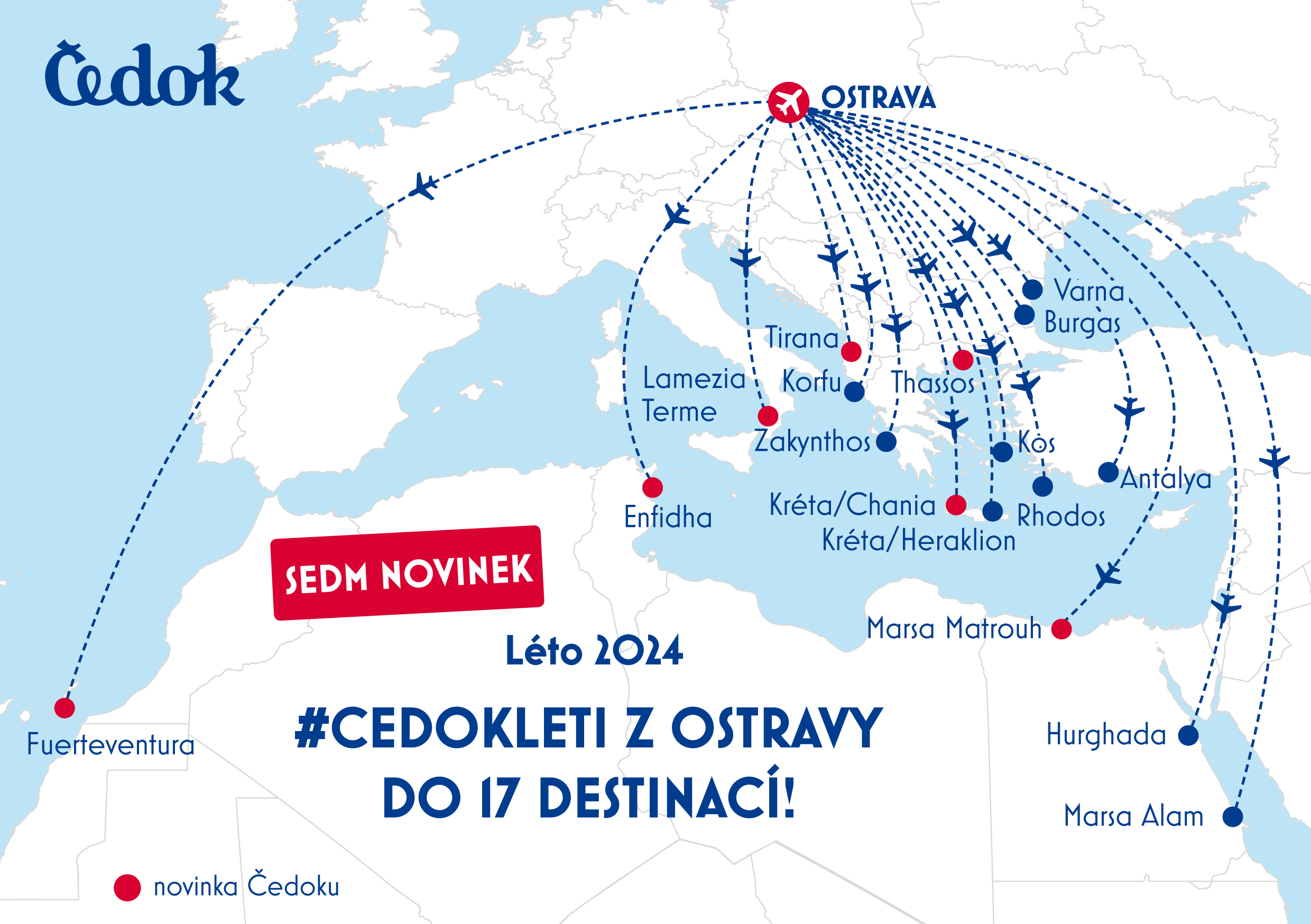 „Pro regionální letiště v Ostravě tento rok chystáme historicky vůbec největší expanzi. V létě naše klienty vezmeme do rekordních sedmnácti destinací, přičemž více než třetinu z nich tvoří nové trasy,“ řekl produktový ředitel Čedoku Miroslav Kubáč. „Jako novinku na léto přidáváme navíc menší řecký ostrov Thassos. V součtu plánujeme počet našich cestujících z mošnovského letiště, oproti předchozímu létu, zdvojnásobit,“ prozradil plány Miroslav Kubáč.